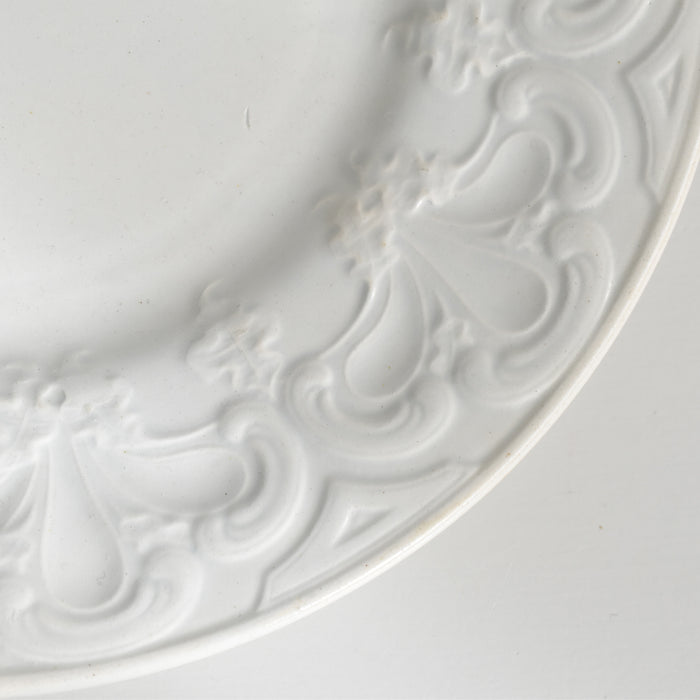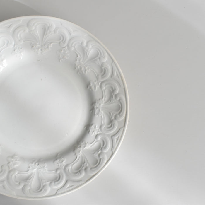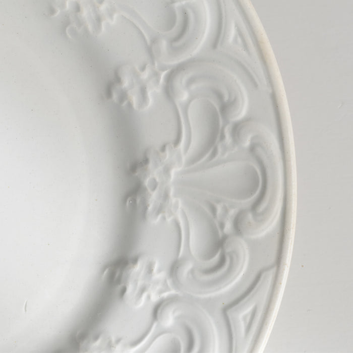 素朴な白の釉薬が、土の温もりを優しく包み込み、繊細なレリーフを際立たせます。
