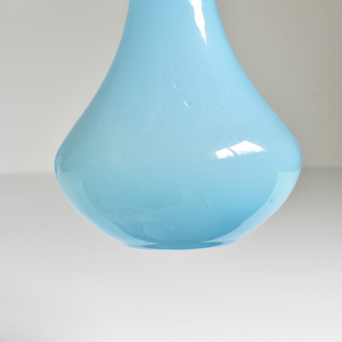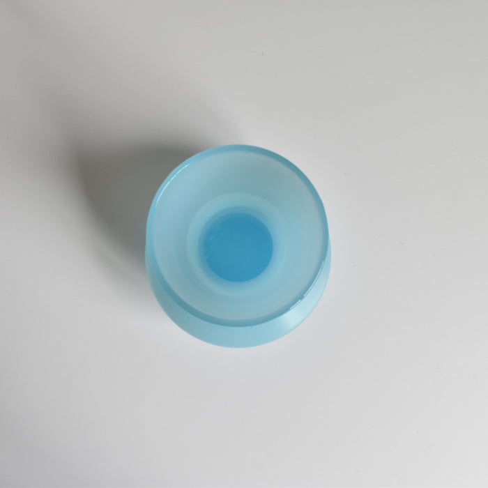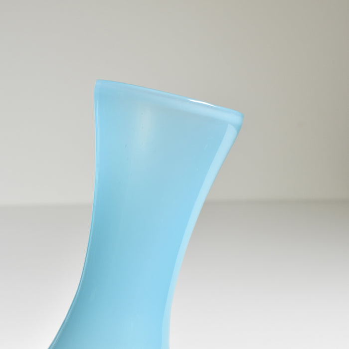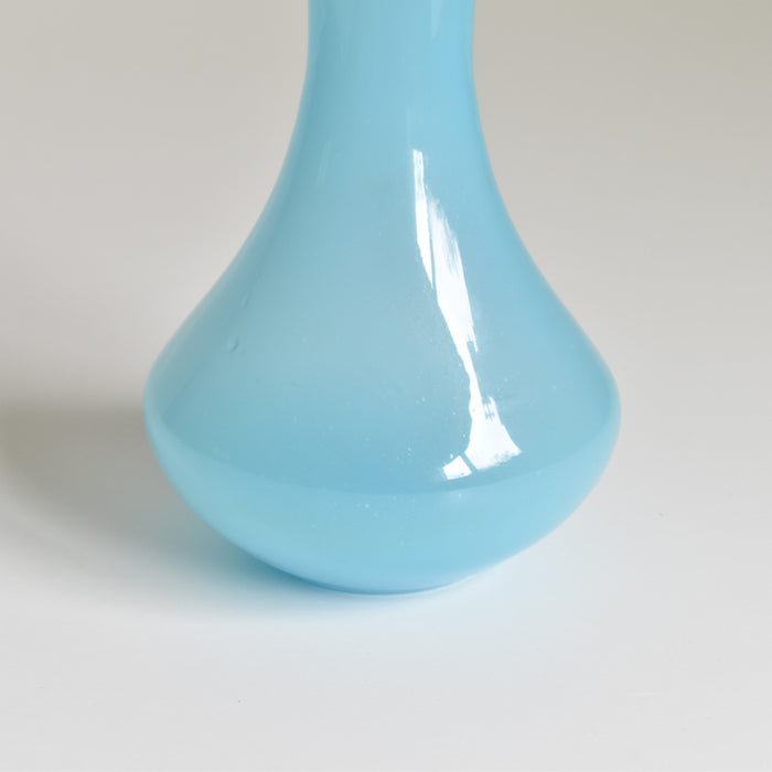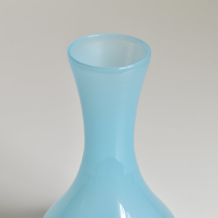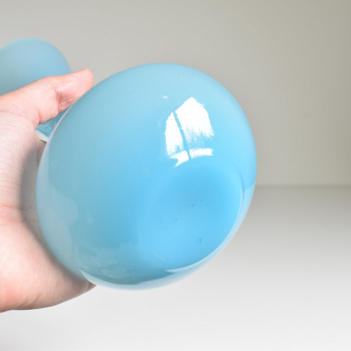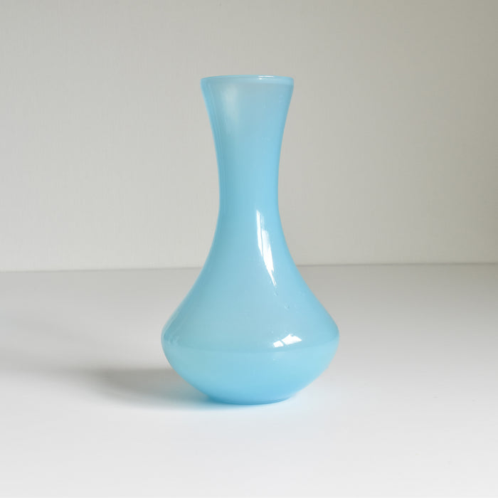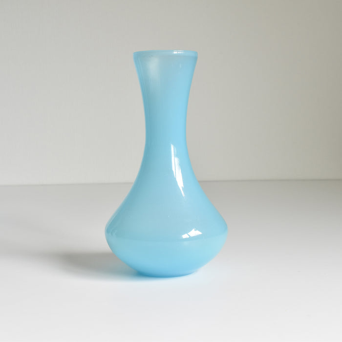 コロンとした丸みを帯びたフォルムが特徴的な、淡い水色のオパリンガラス製フラワーベースです。