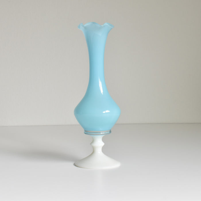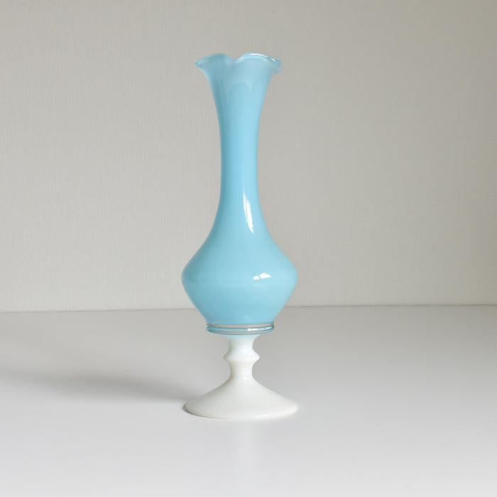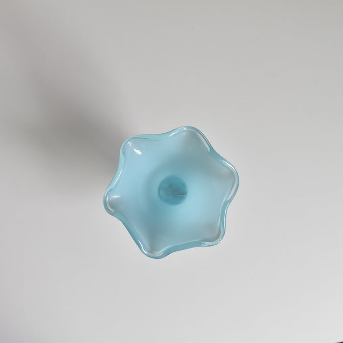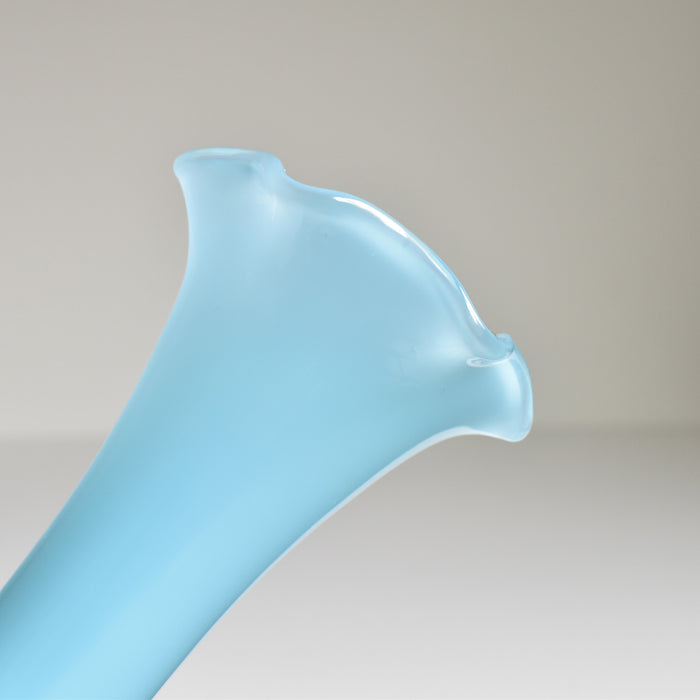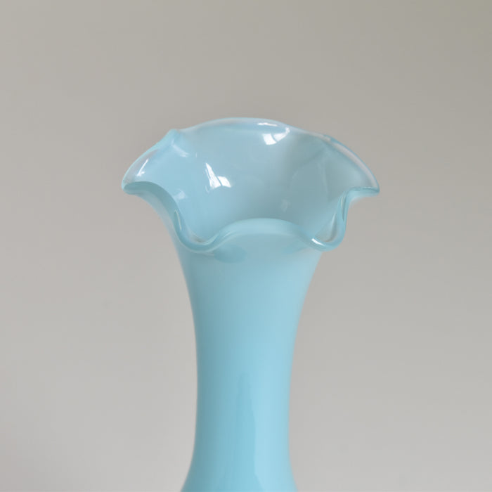 淡い水色のオパリンガラス製です、丸みを帯びた胴部分と、細く伸びる首、そしてフリル状の口縁が特徴的なフラワーベースです。