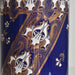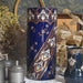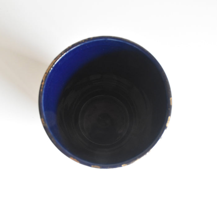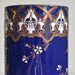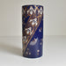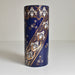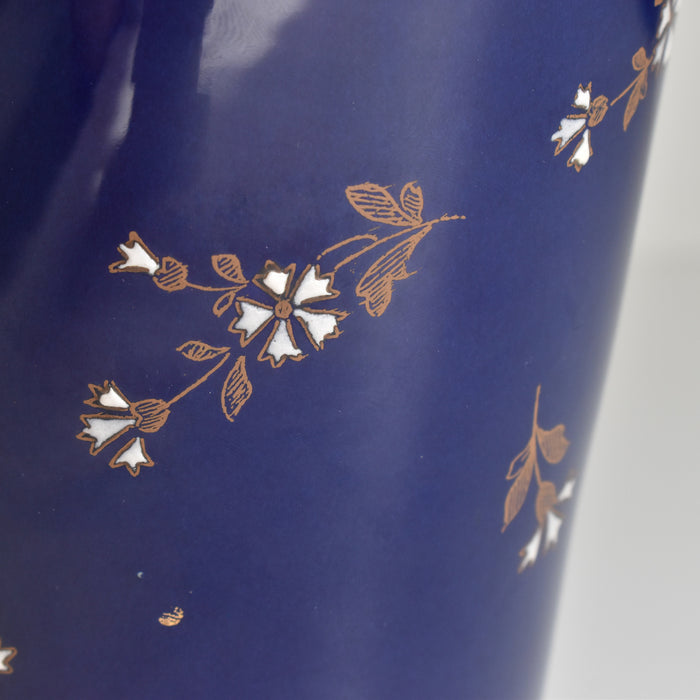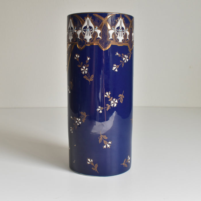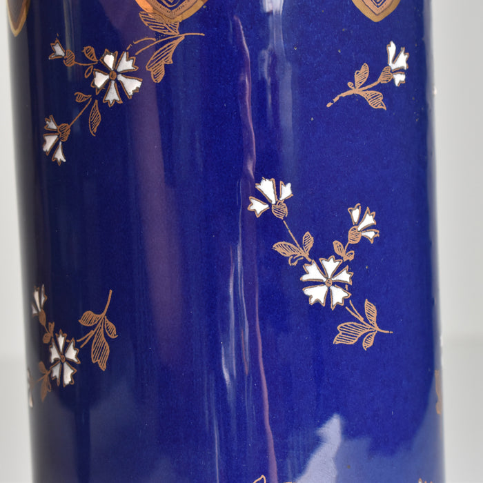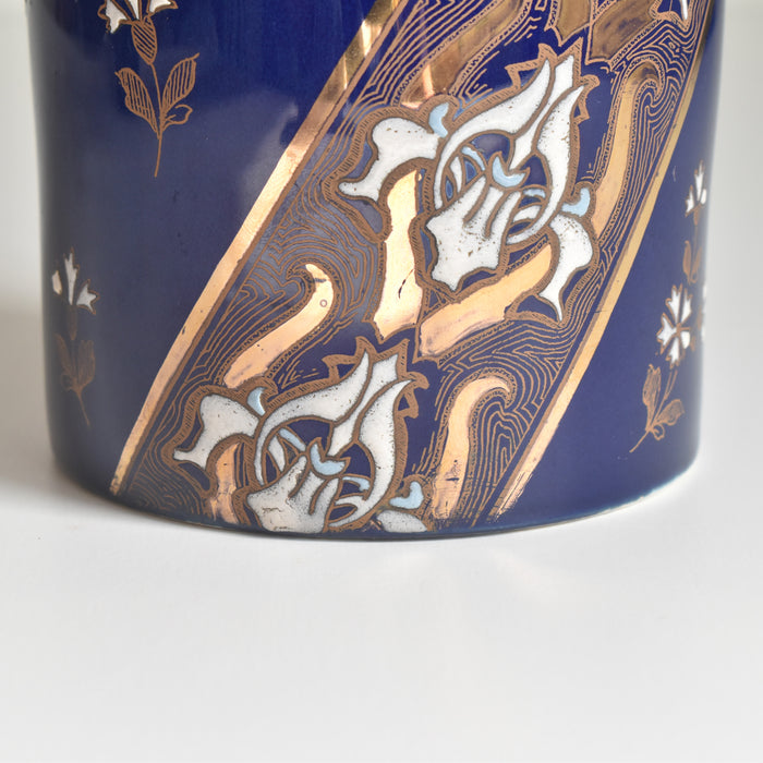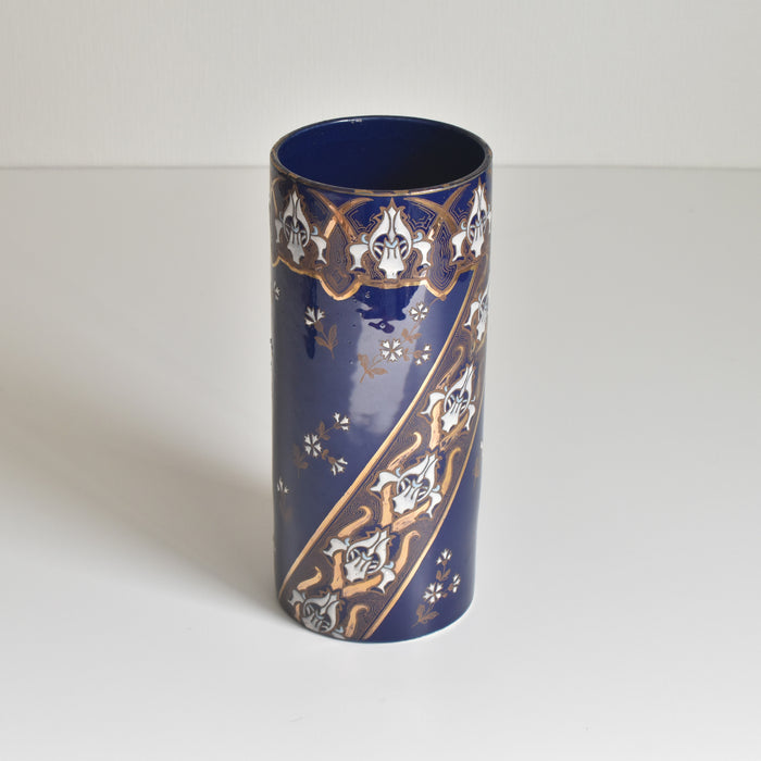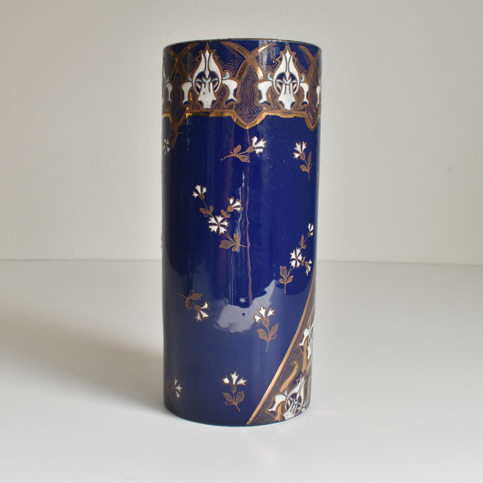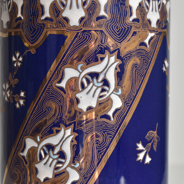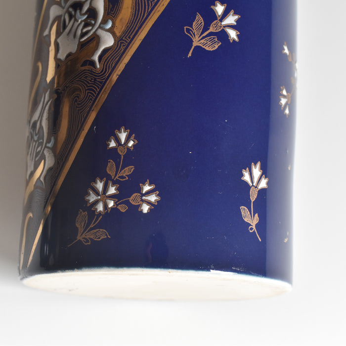 筒形のシンプルな形状で、どんな花にも合わせやすいデザインです。セーヴルブルーと呼ばれる色で覆われており、金彩や白とライトブルーの釉薬で花柄模様が描かれています。アールヌーボー様式の影響が見られ、豪華で華やかな印象です。