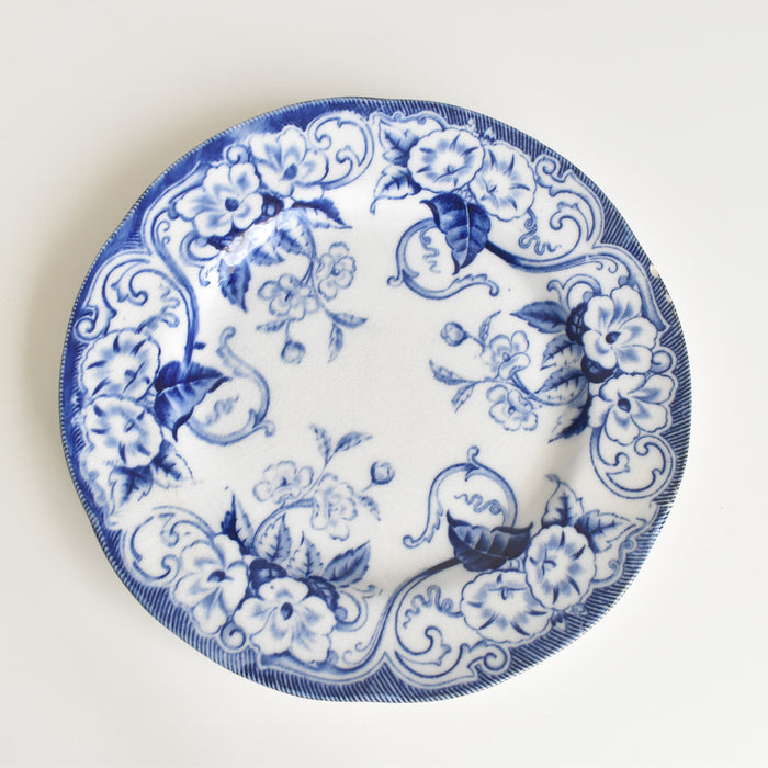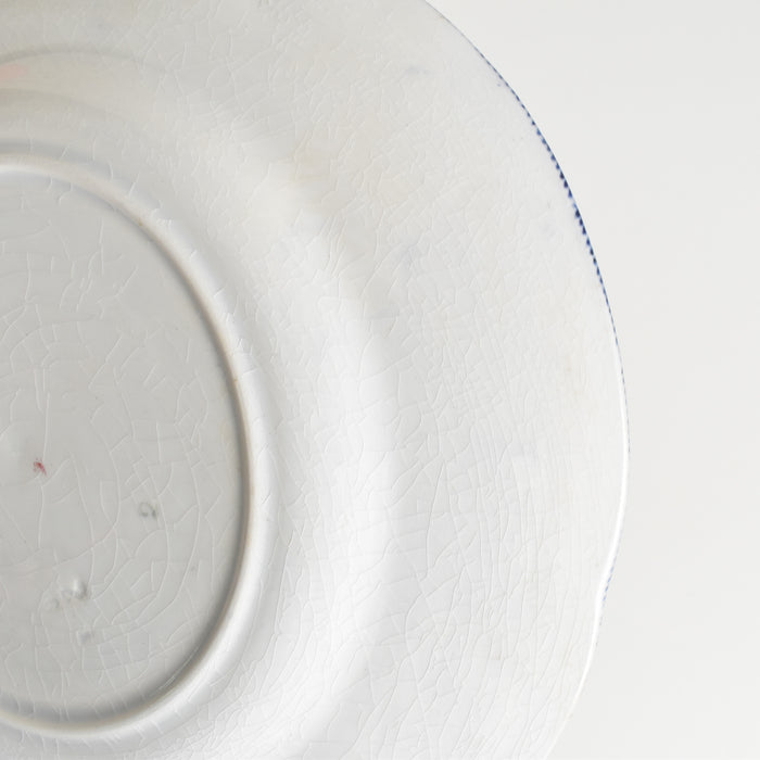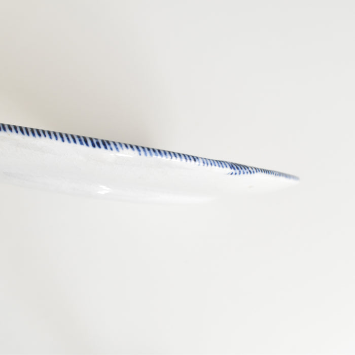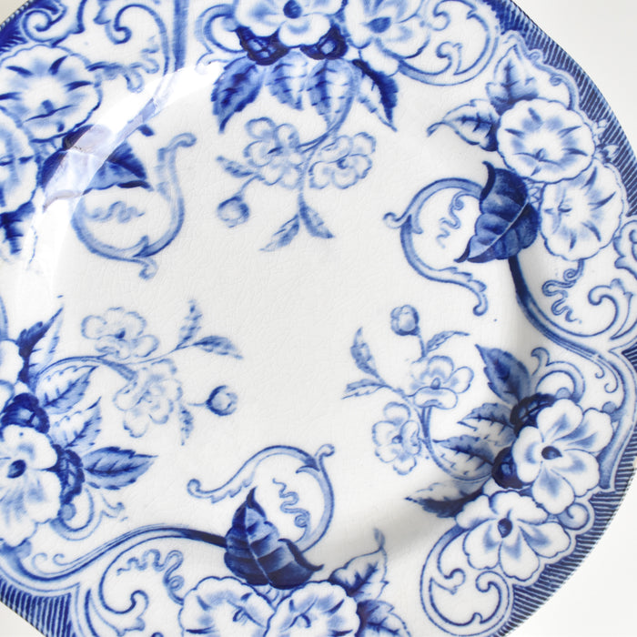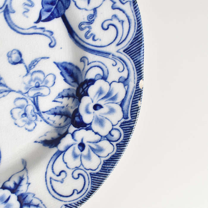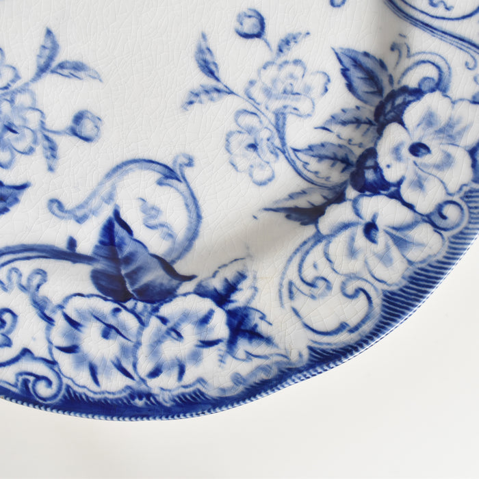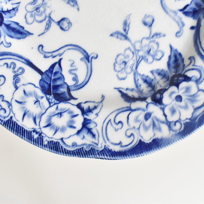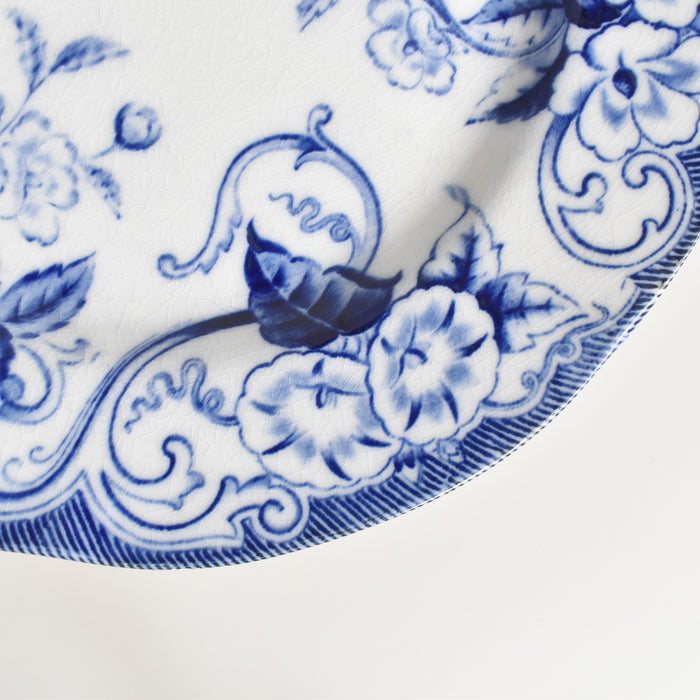 美しいブルー&ホワイト。そのはっきりとしたコントラストは透明感を生み出しています。縁から生き生きと伸びる花々が印象的な一品です。