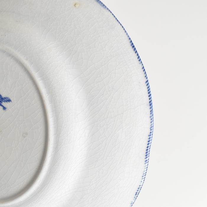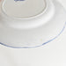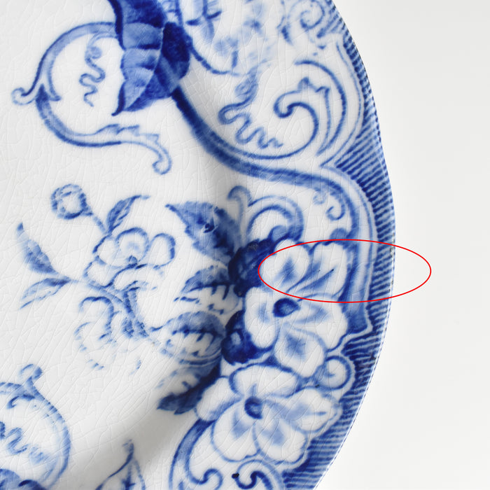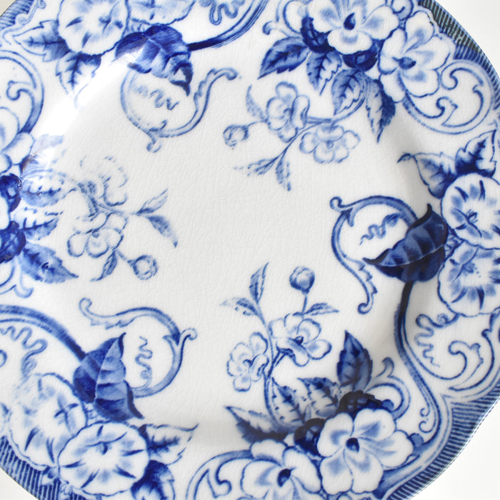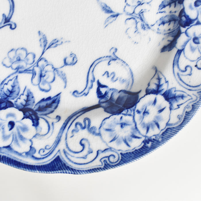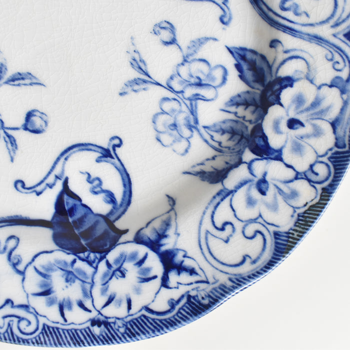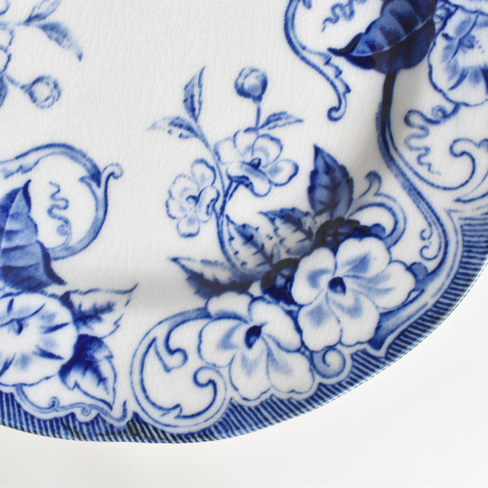美しいブルー&ホワイト。そのはっきりとしたコントラストは透明感を生み出しています。縁から生き生きと伸びる花々が印象的な一品です。