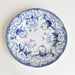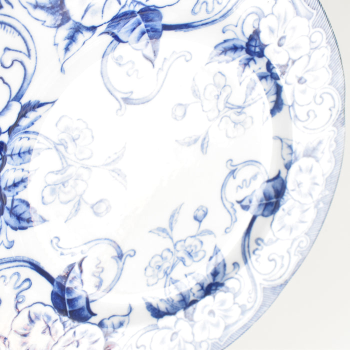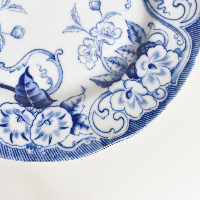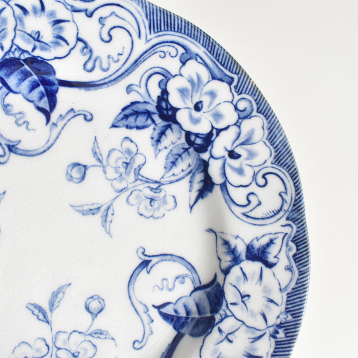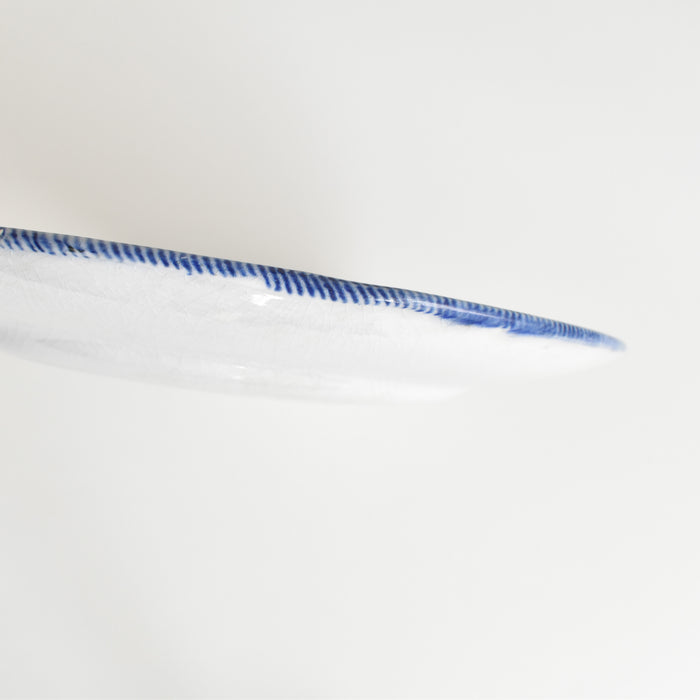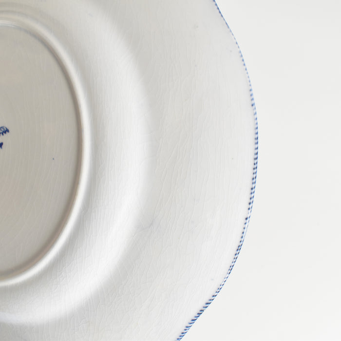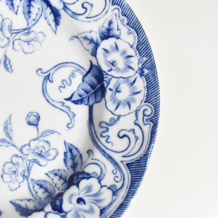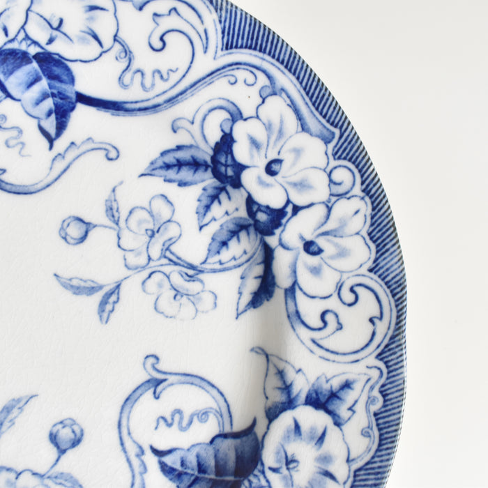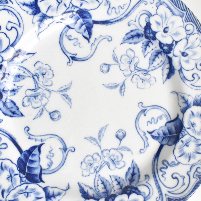 美しいブルー&ホワイト。そのはっきりとしたコントラストは透明感を生み出しています。縁から生き生きと伸びる花々が印象的な一品です。