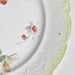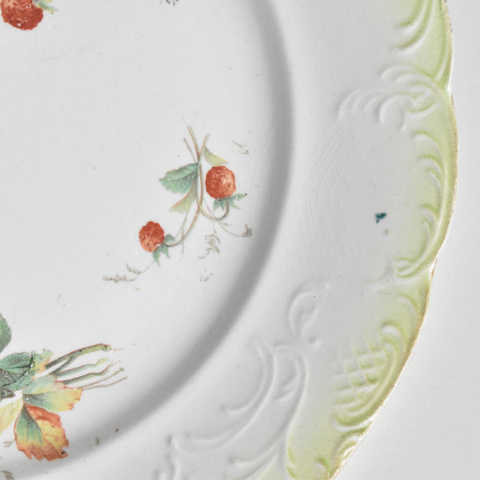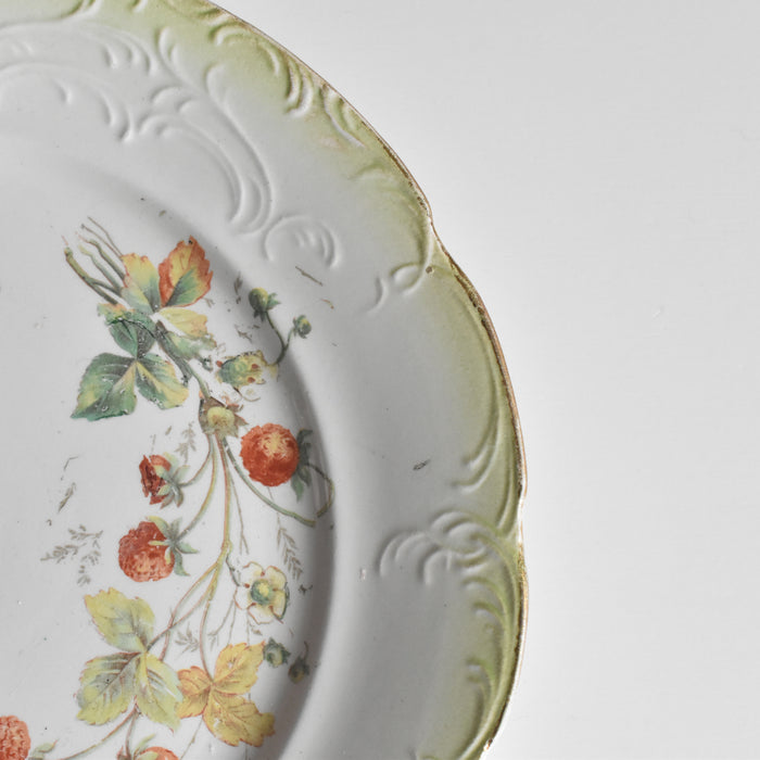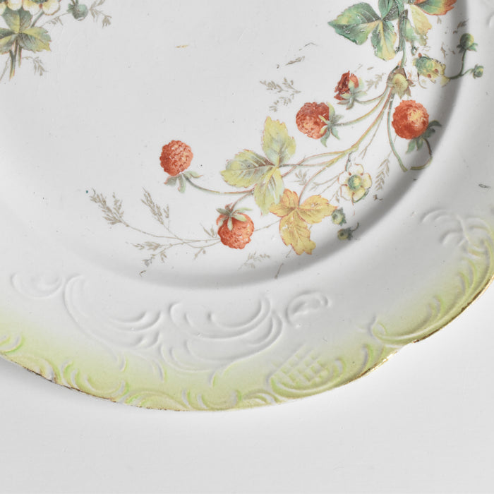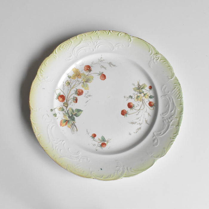縁に繊細で美しいレリーフが施され、見込みには愛らしいいちごのプリントが印象的なアンティークのデザートプレートです。