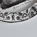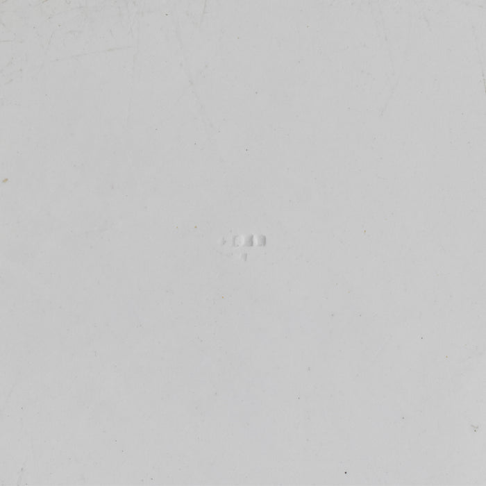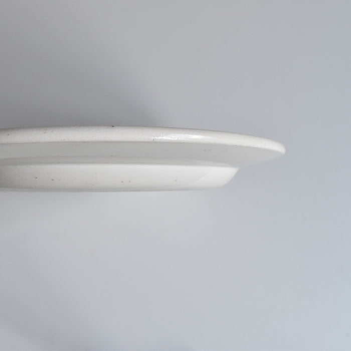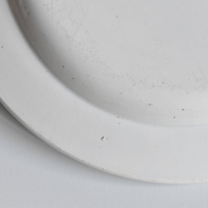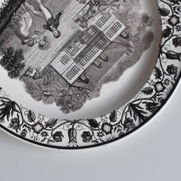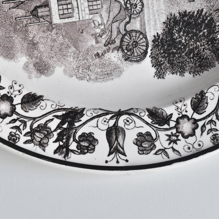グリザイユ技法によるモノクロの絵付けが美しく、縁の装飾も上品な一品。