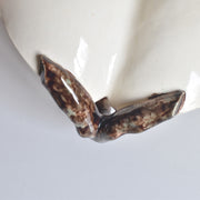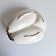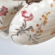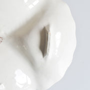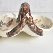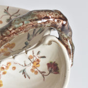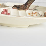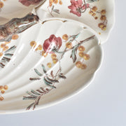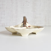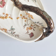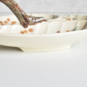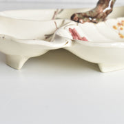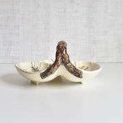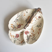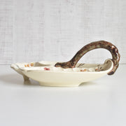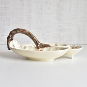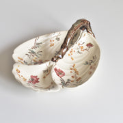 「マンディアン」と呼ばれるこの形は、元々はナッツやドライフルーツを盛り付けるためのもの。中央に木の枝を模したハンドルが付いており、三つに仕切られたスカラップ状のフォルムが、まるで大輪の花が咲いたような優雅さを放ちます。