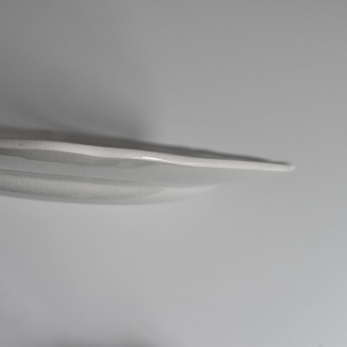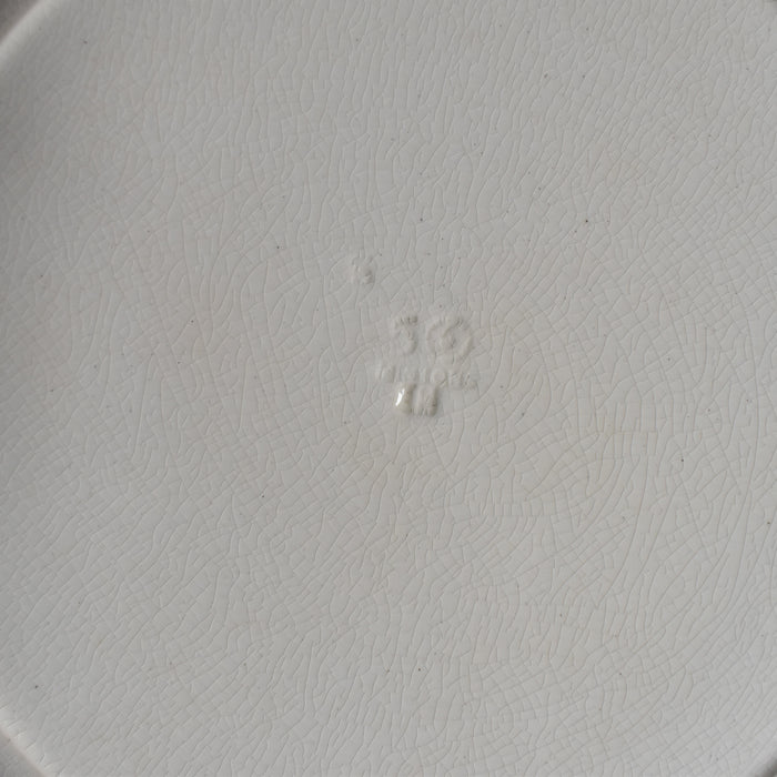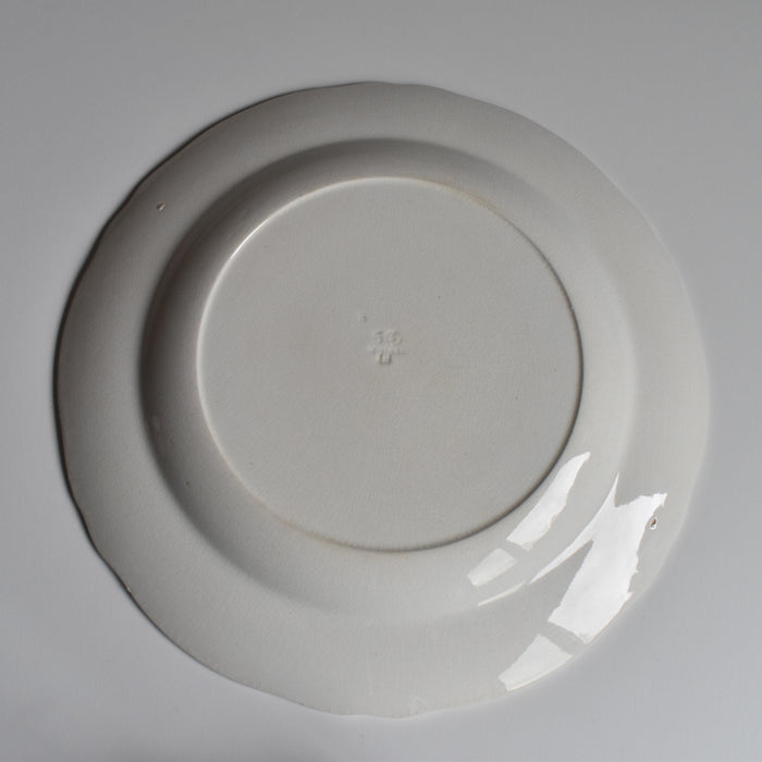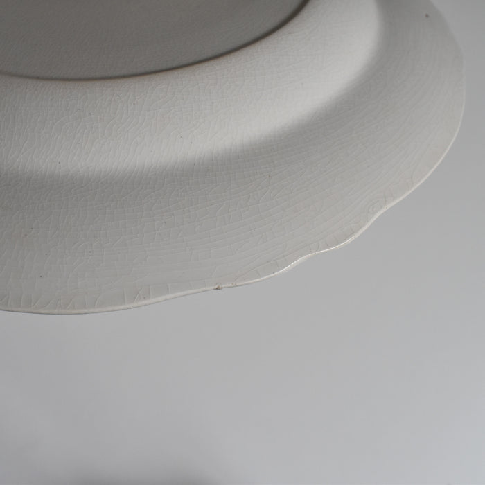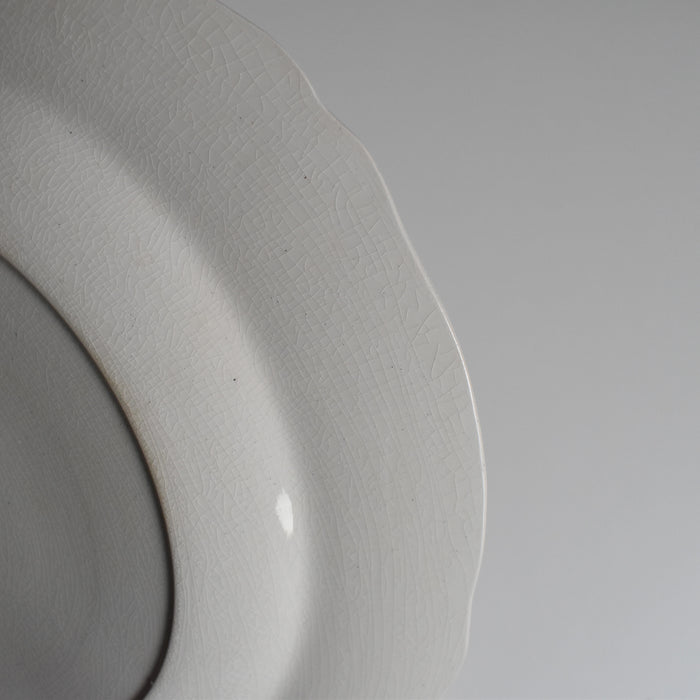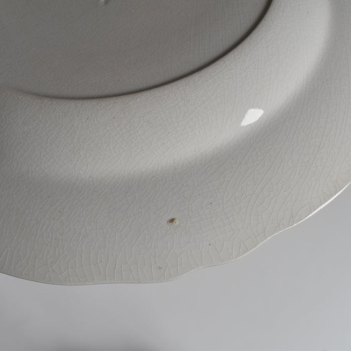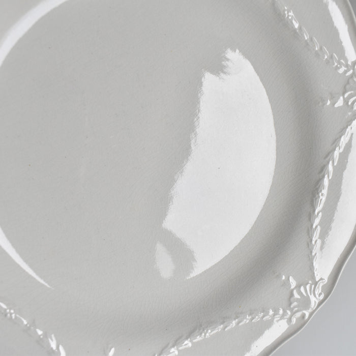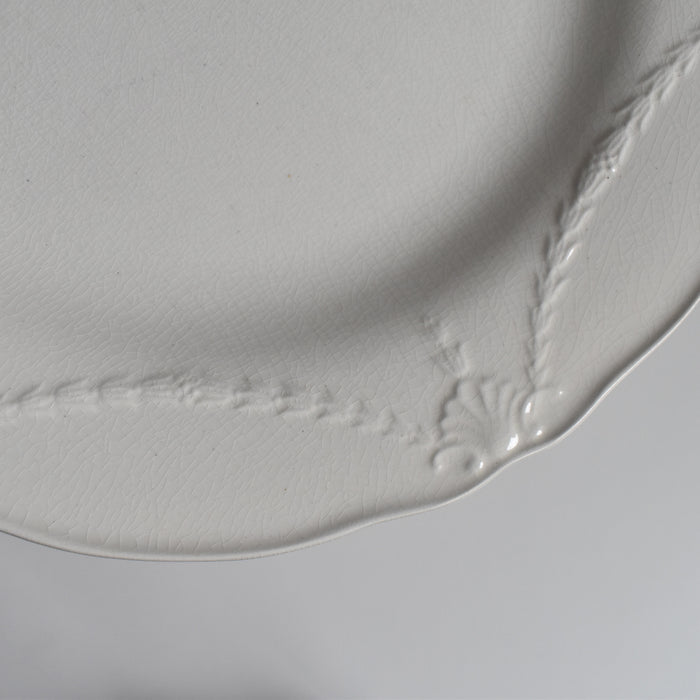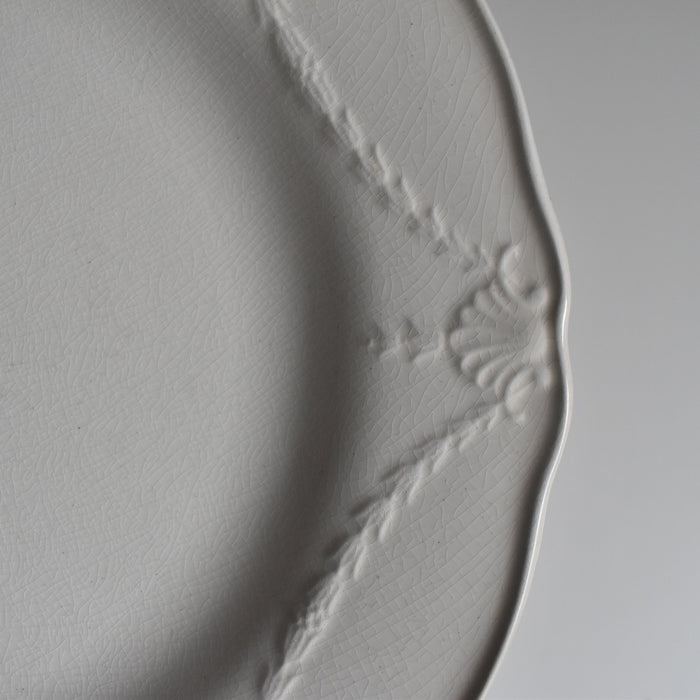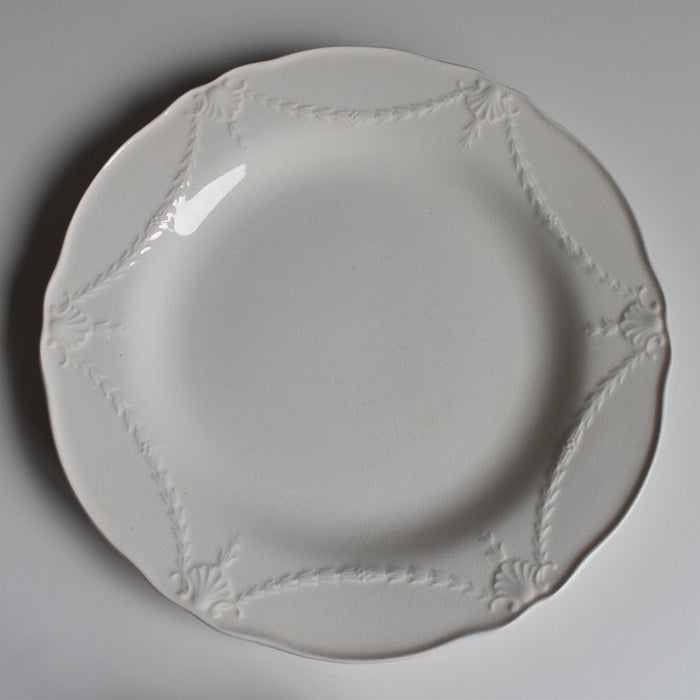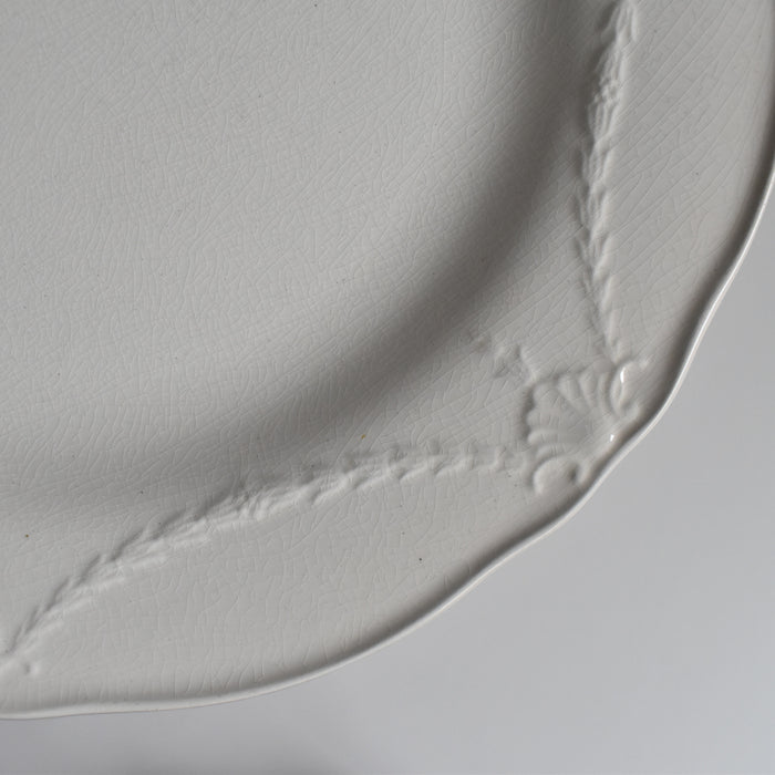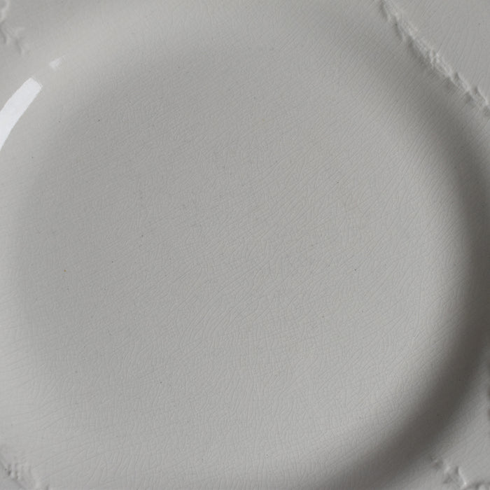ガーランド柄の細やかなレリーフの美しさが際立った一品。細やかな貫入とシミの具合がアンティークの温もりを感じさせる素敵なプレートです。