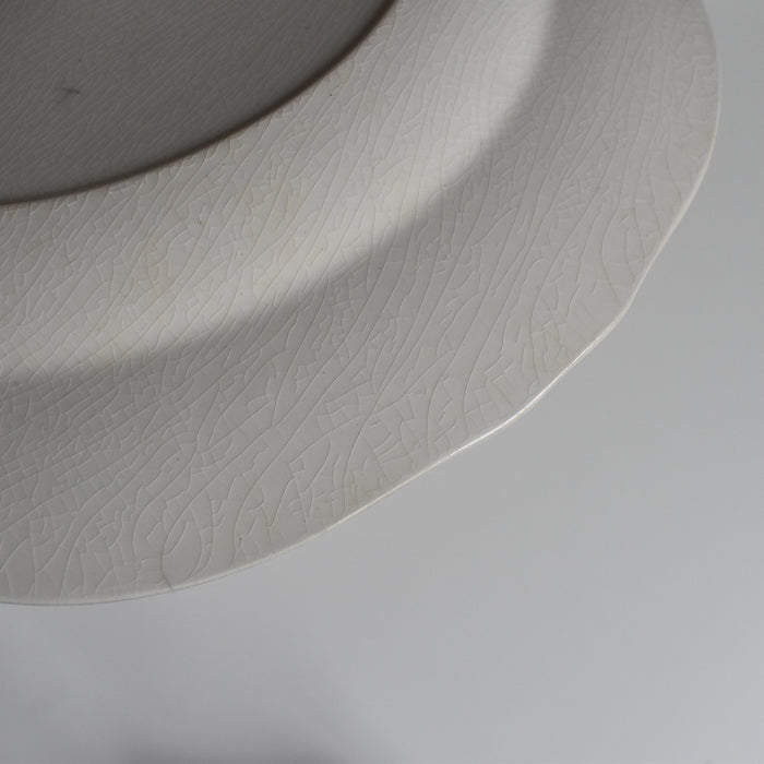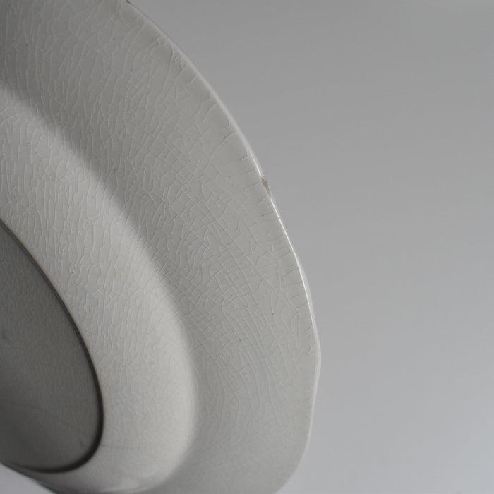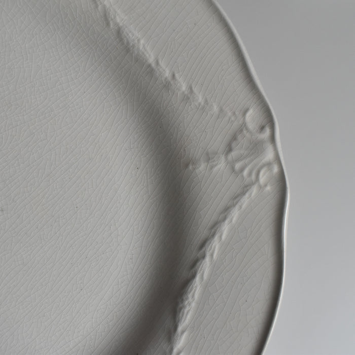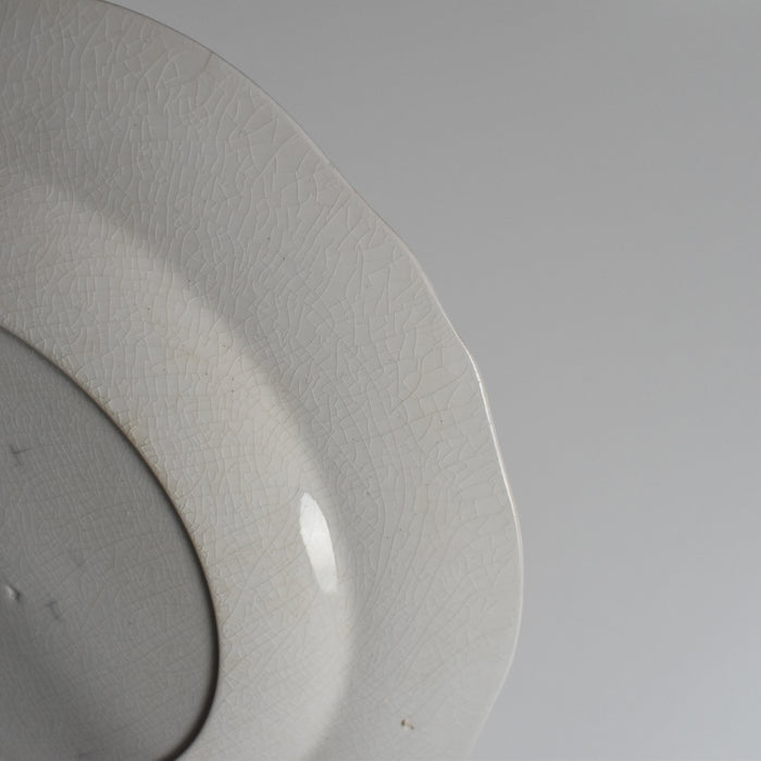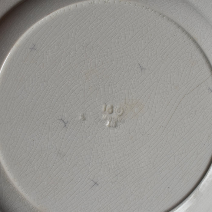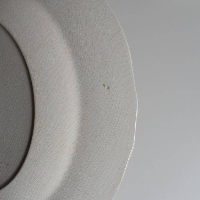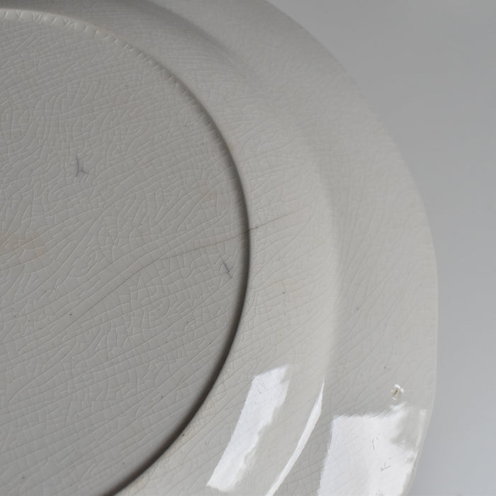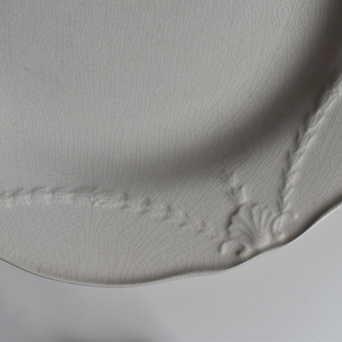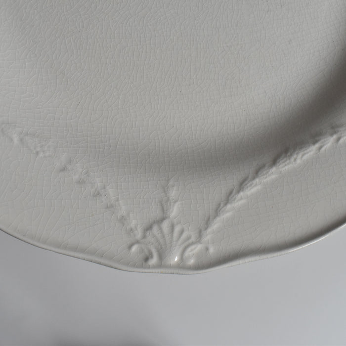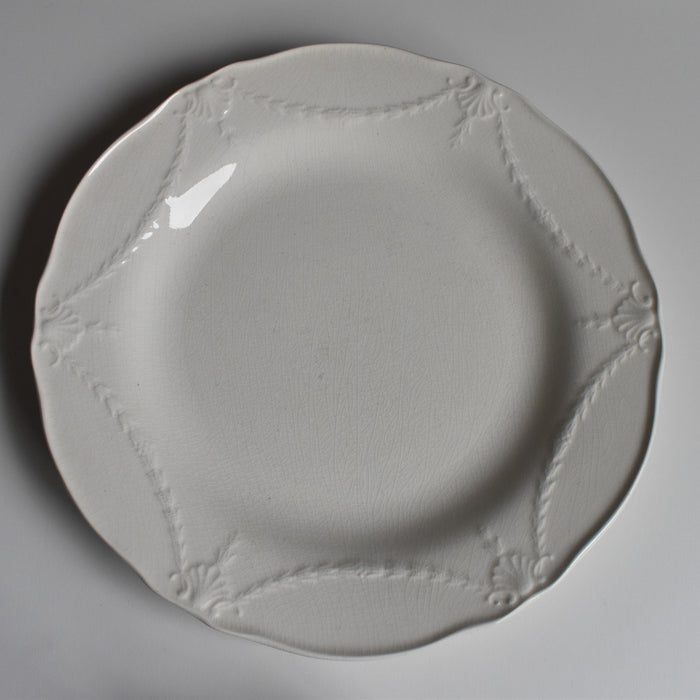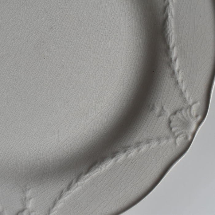ガーランド柄の細やかなレリーフの美しさが際立った一品。細やかな貫入とシミの具合がアンティークの温もりを感じさせる素敵なプレートです。