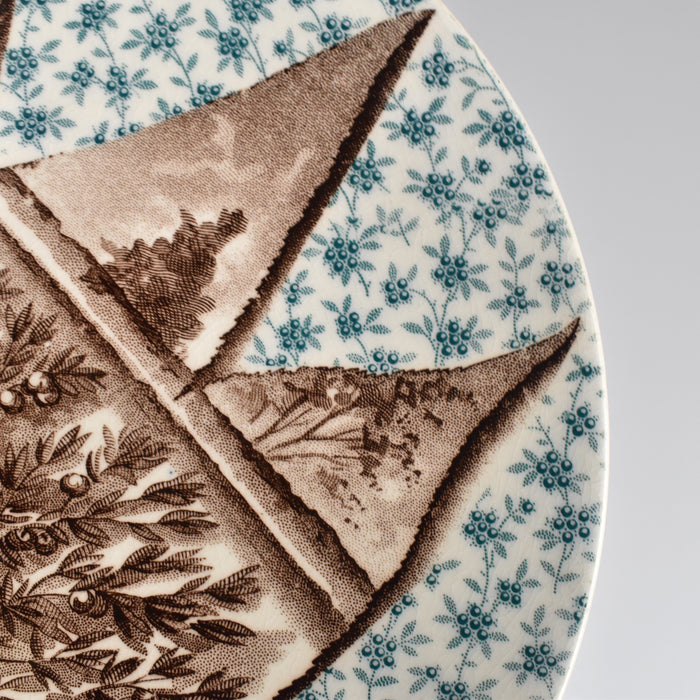 いろんな果樹が描かれているシリーズです。お皿の全体は、青緑色の小さいベリーのタペストリーのようなデザインになっており懐かしさを感じさせます。