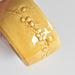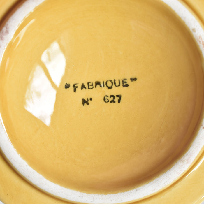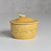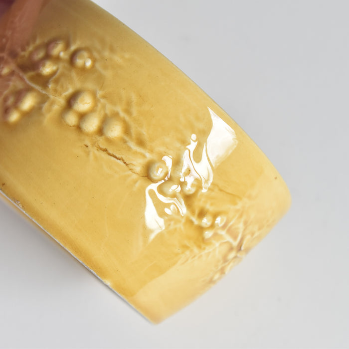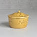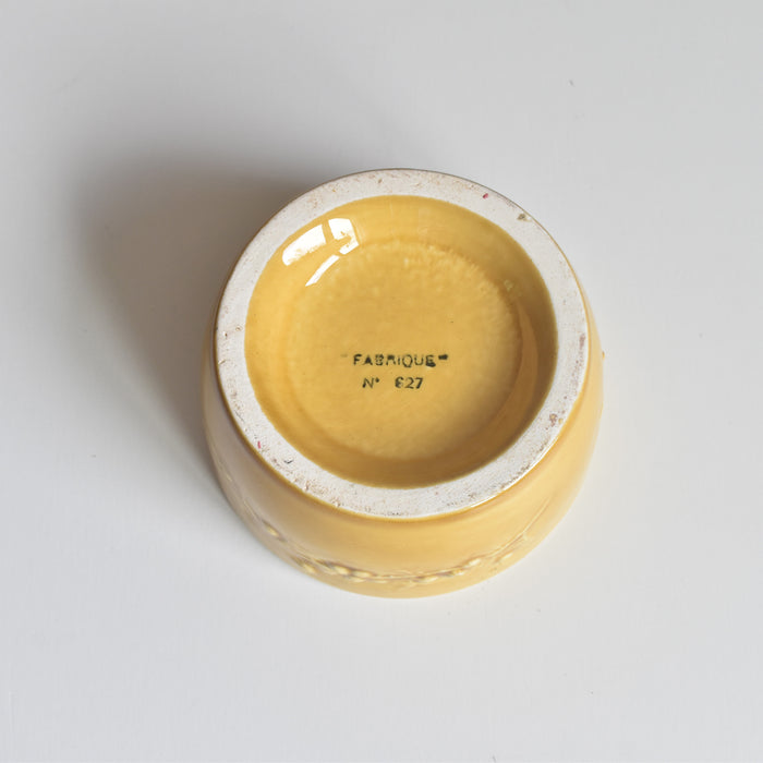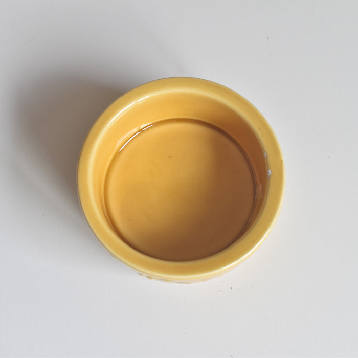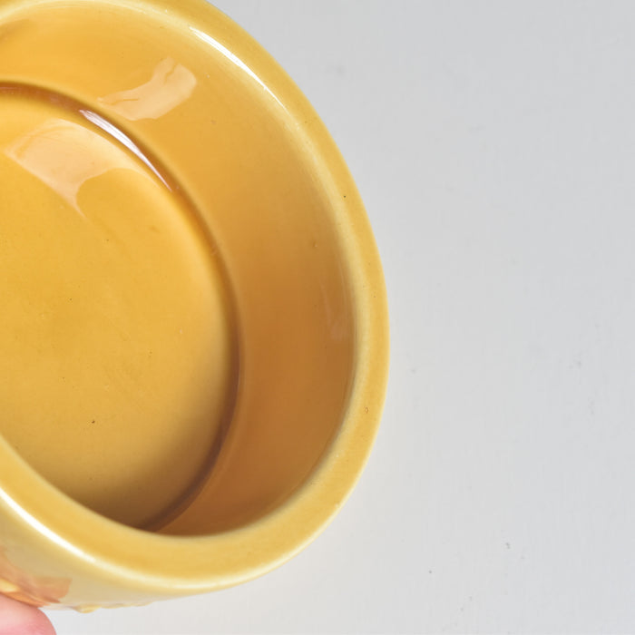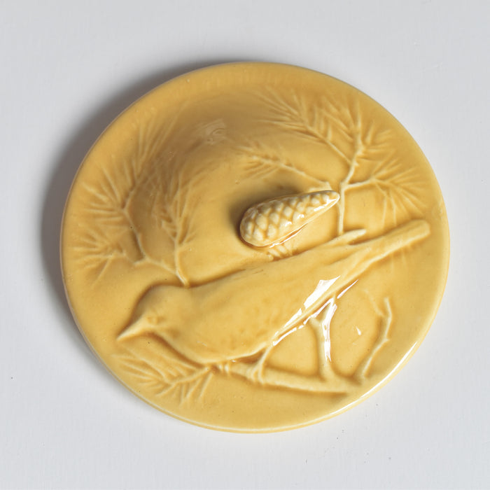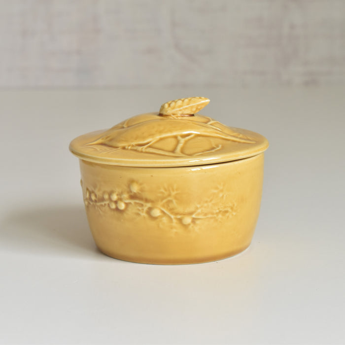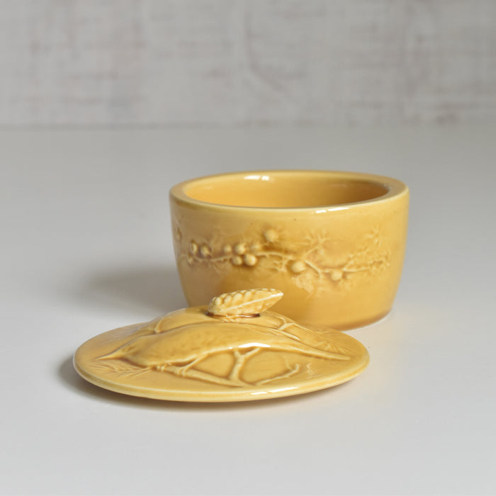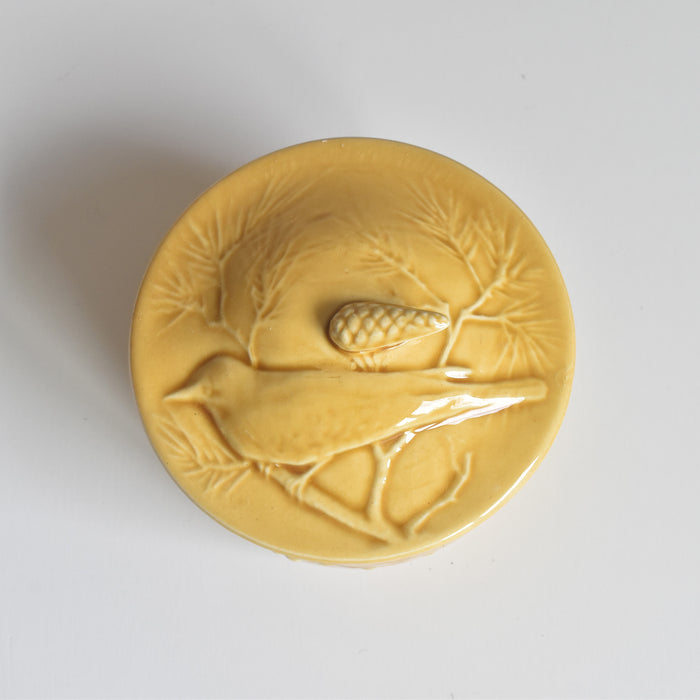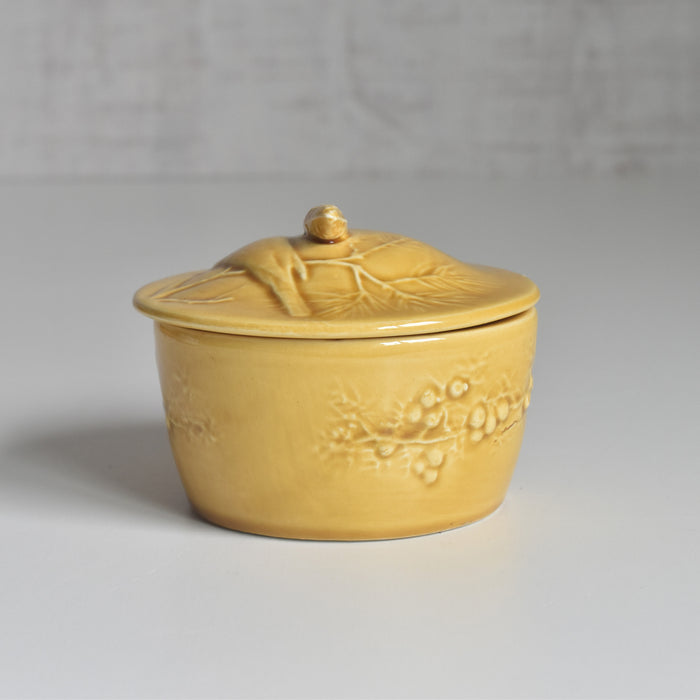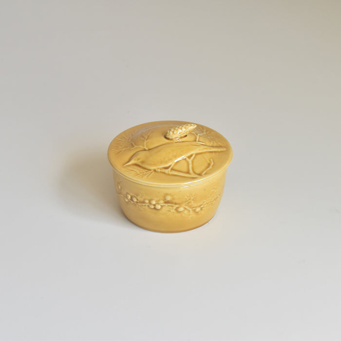 温かみのあるイエロー系の色合いが特徴で、蓋には鳥と松ぼっくり、そして容器の側面には実をつけた枝のモチーフが立体的にデザインされています。