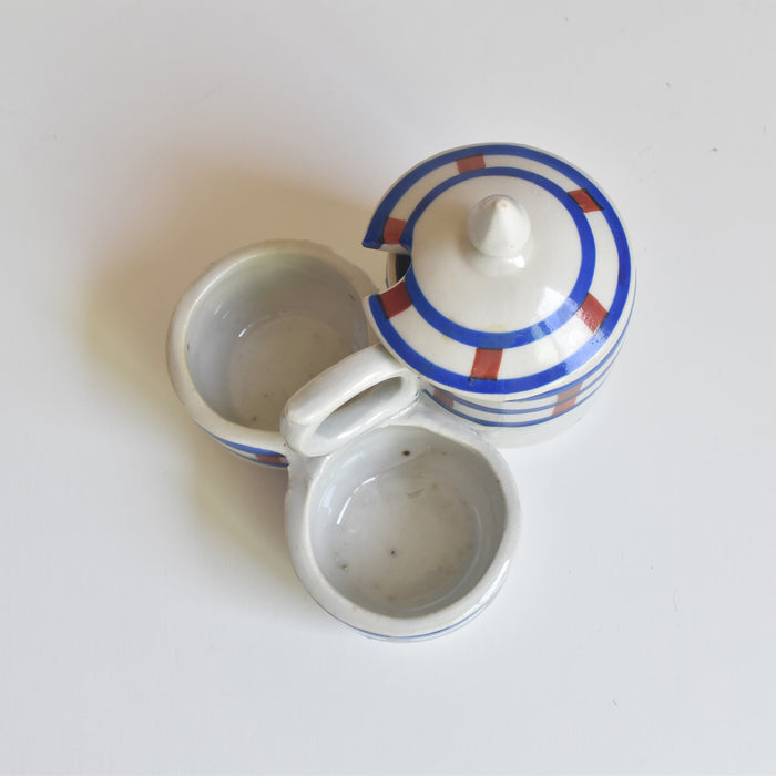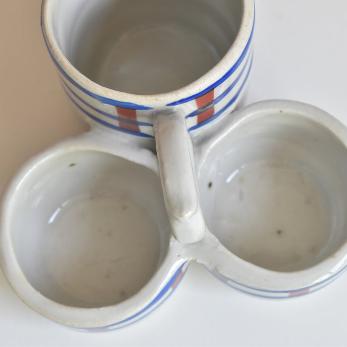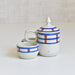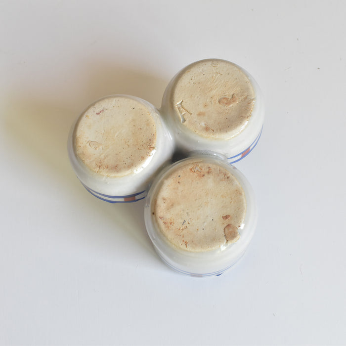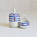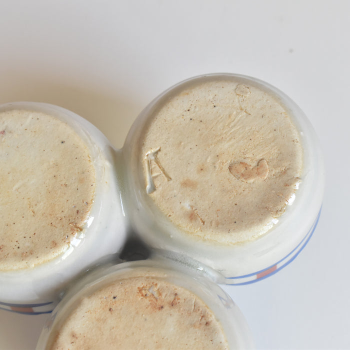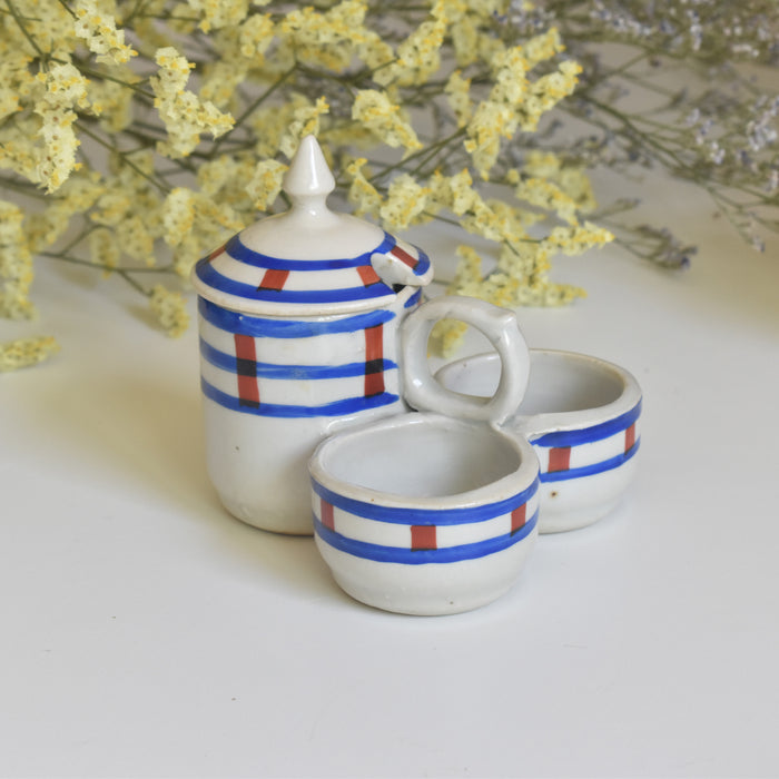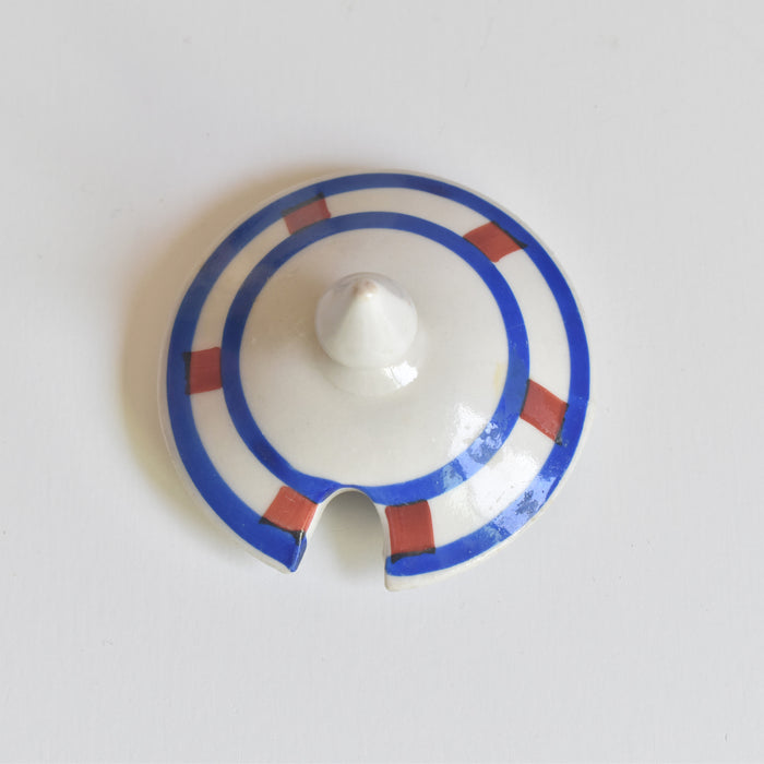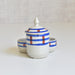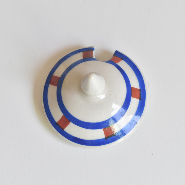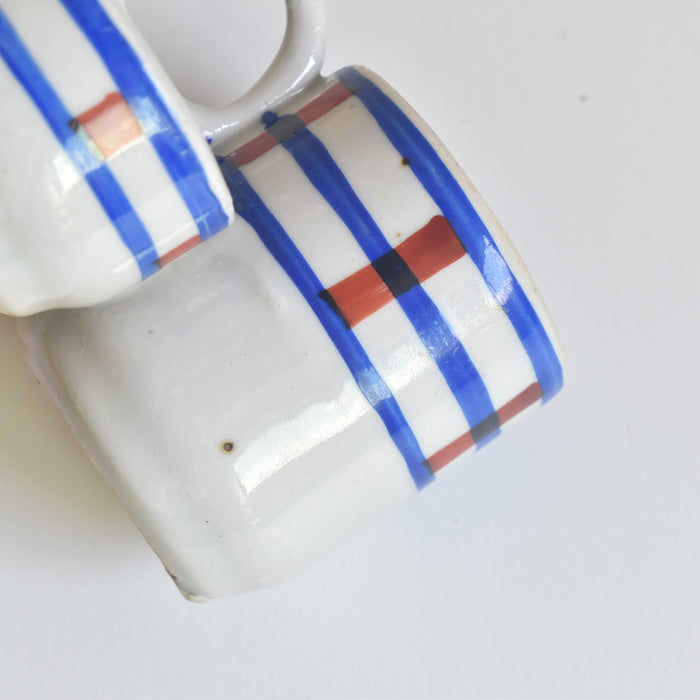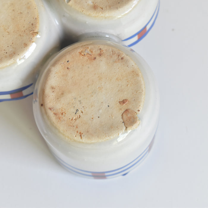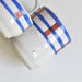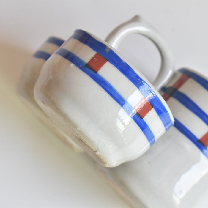 深いブルーと赤のストライプが特徴的な「バスク柄」が手描きされており、温かみのあるフレンチカントリーの雰囲気を醸し出しています。