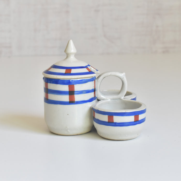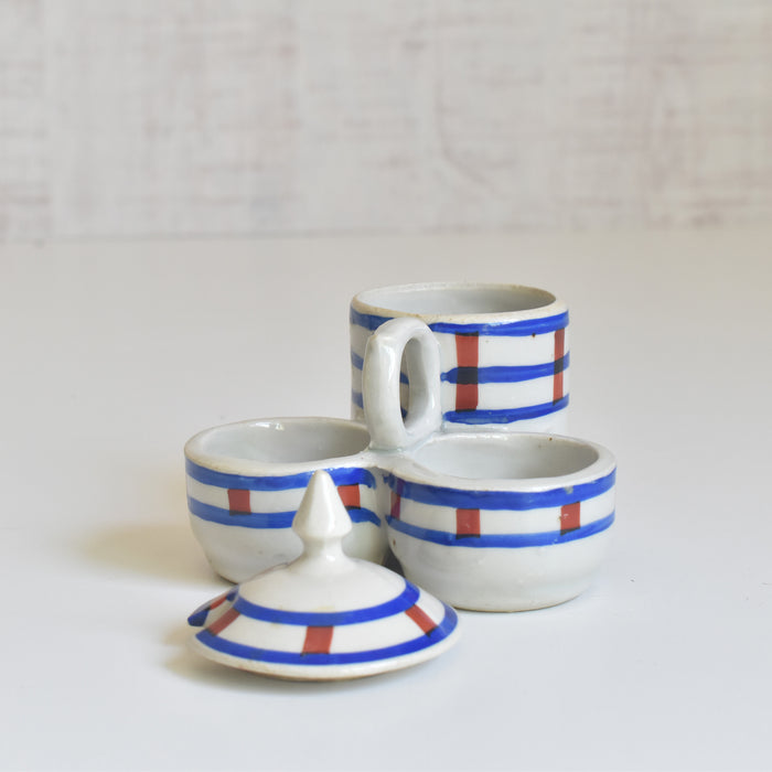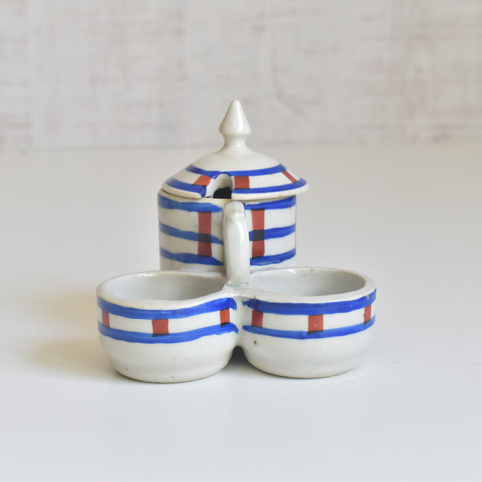 中央にマスタードや調味料を入れられる蓋つきのポット、その両脇にソルトとペッパーなどを入れるためのボウルが配された実用的なデザイン。
