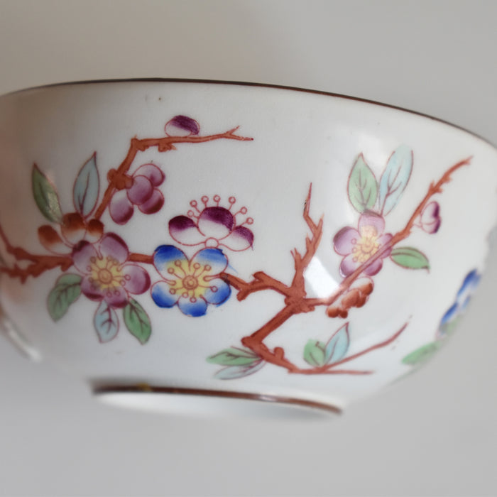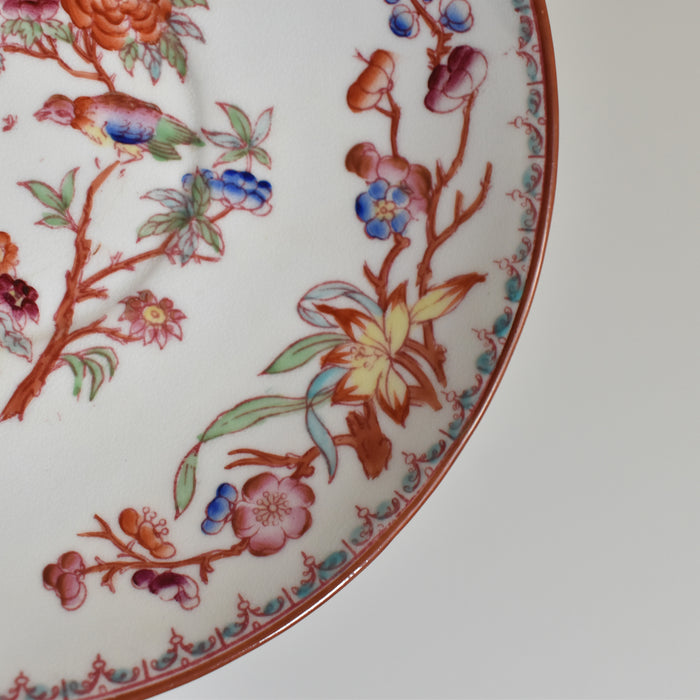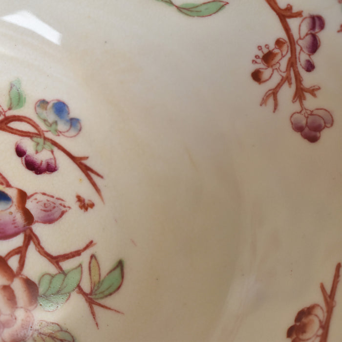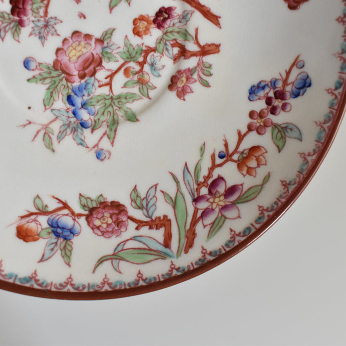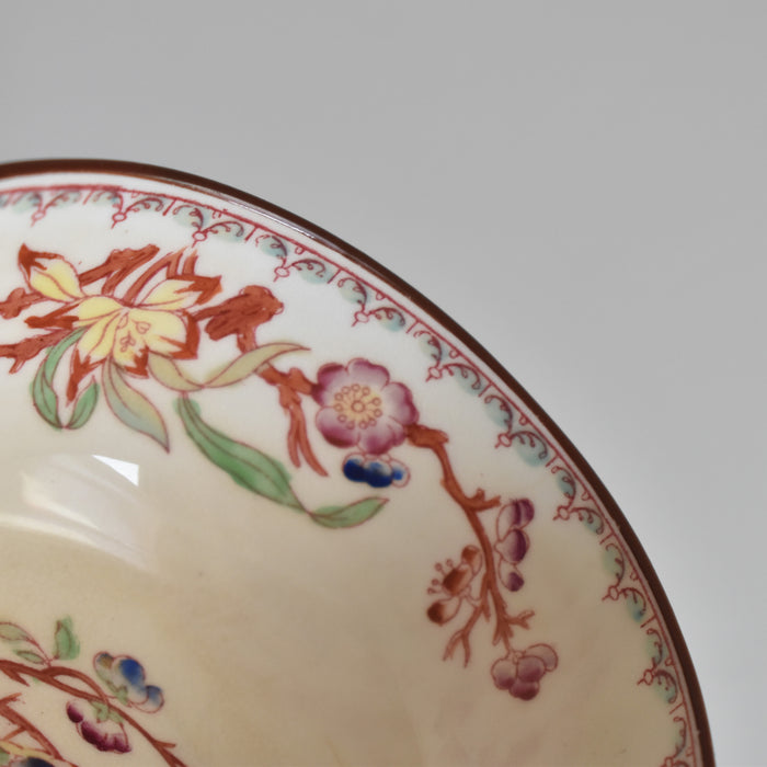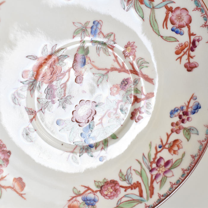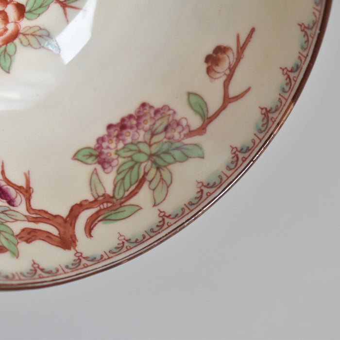 鮮やかな色使いで描かれた花模様。トランスファーの上からハンドペイントで色が載せられ、きめ細やかな手仕事を感じます。