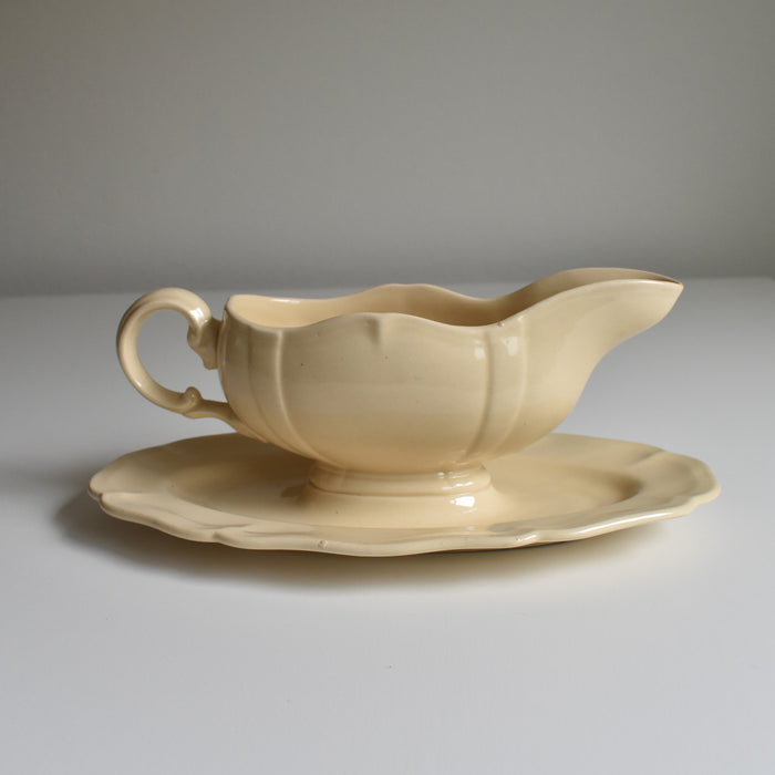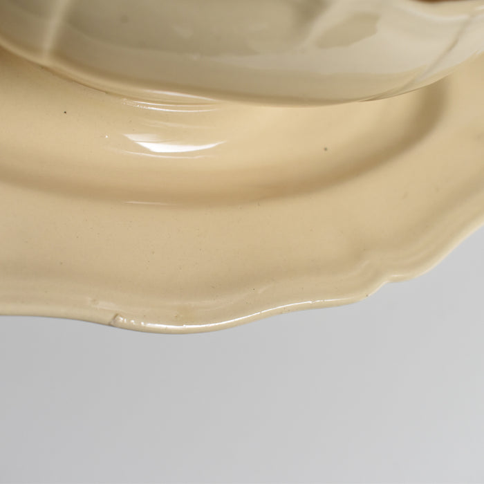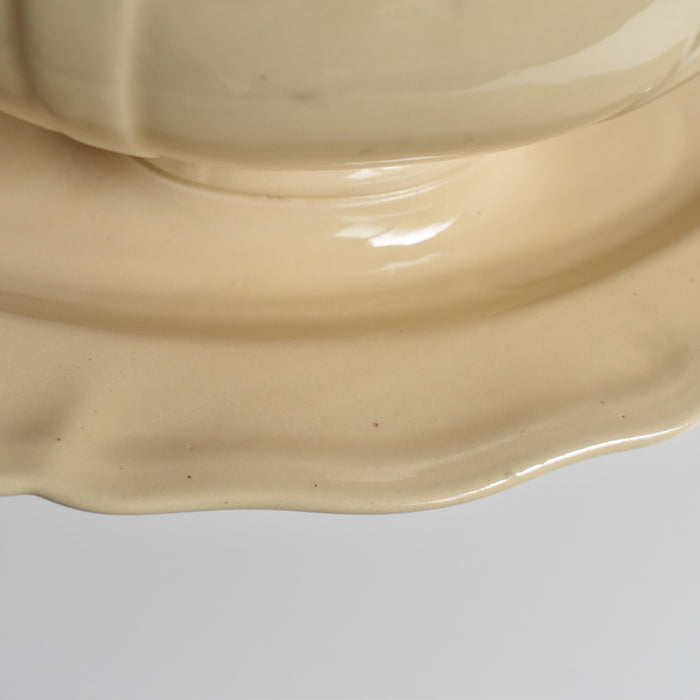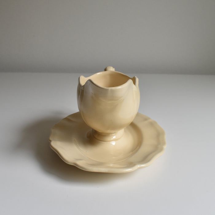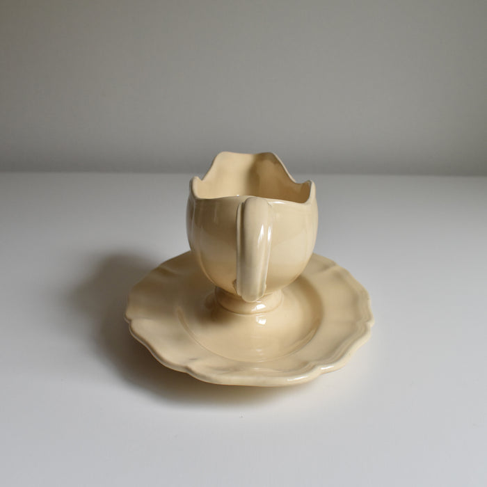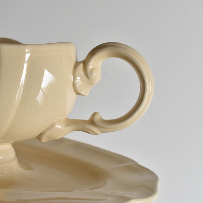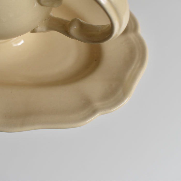 受け皿部分は花リムで可愛らしくソース皿部分にもレリーフが施され、素朴さの中に可憐さを感じます。