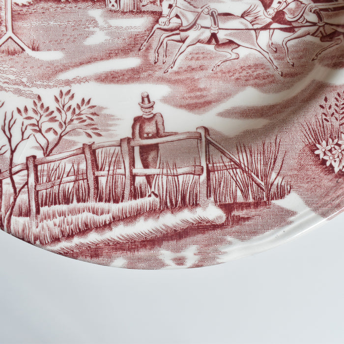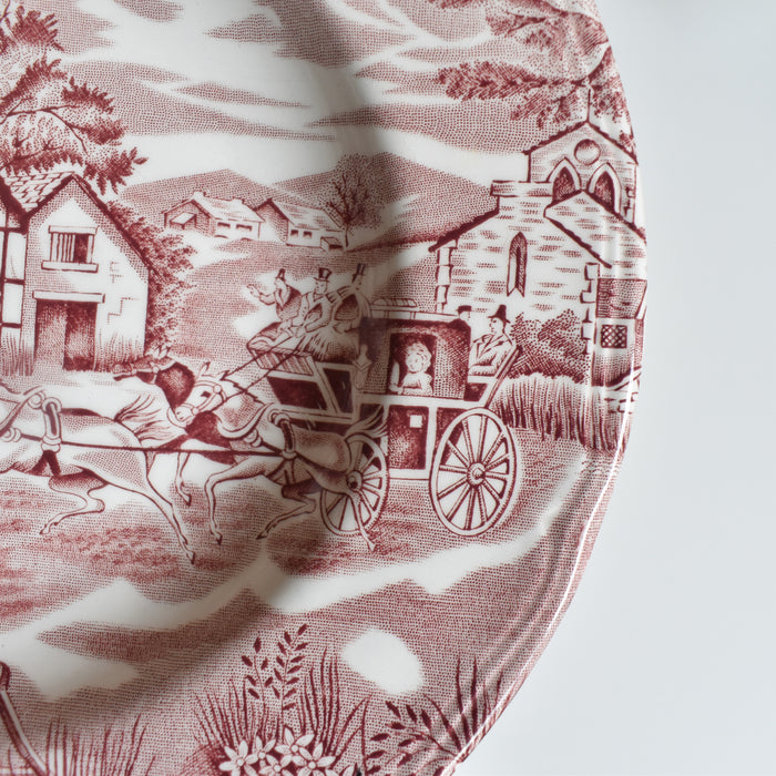 4頭の馬がひく豪華な馬車が、穏やかな田舎を勢いよく走る様子からは、この絵皿に秘められたストーリーを感じます。