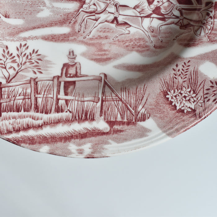 4頭の馬がひく豪華な馬車が、穏やかな田舎を勢いよく走る様子からは、この絵皿に秘められたストーリーを感じます。