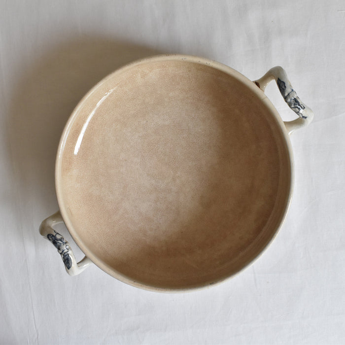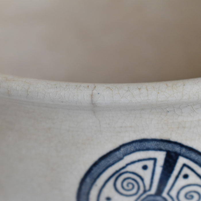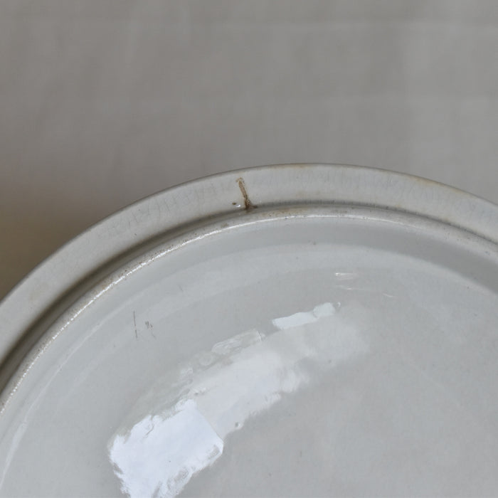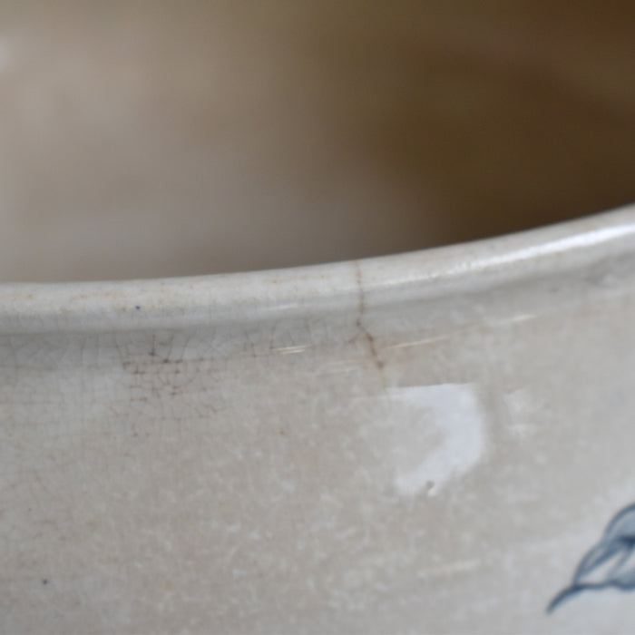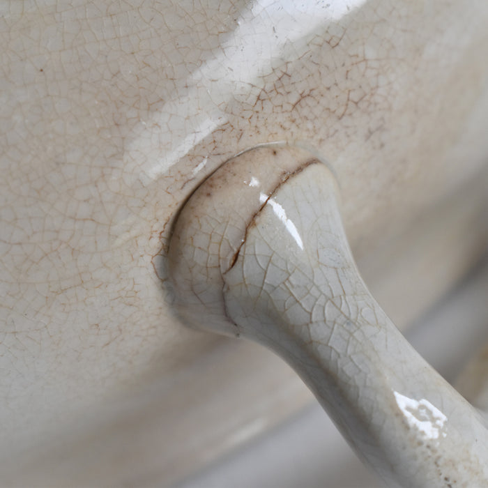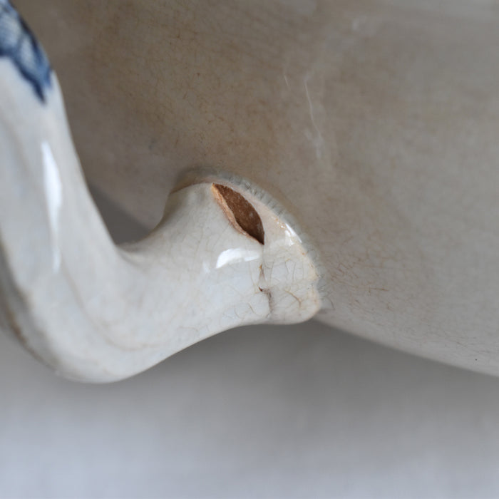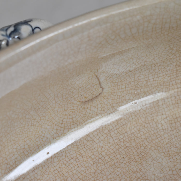 状態:1個の取手が修復されています。全体的に細かい勧誘が広がっていて変色しています。縁部分に数カ所の小さいひびも確認できます。
