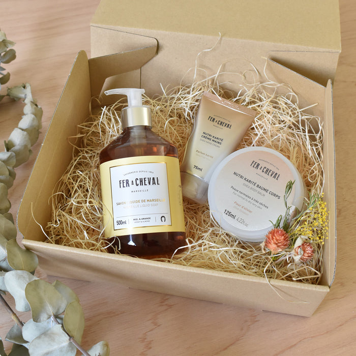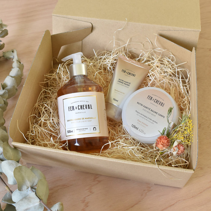 マルセイユリキッドソープ、シアバターハンドクリーム、シアバターボディバームのギフトセットです。