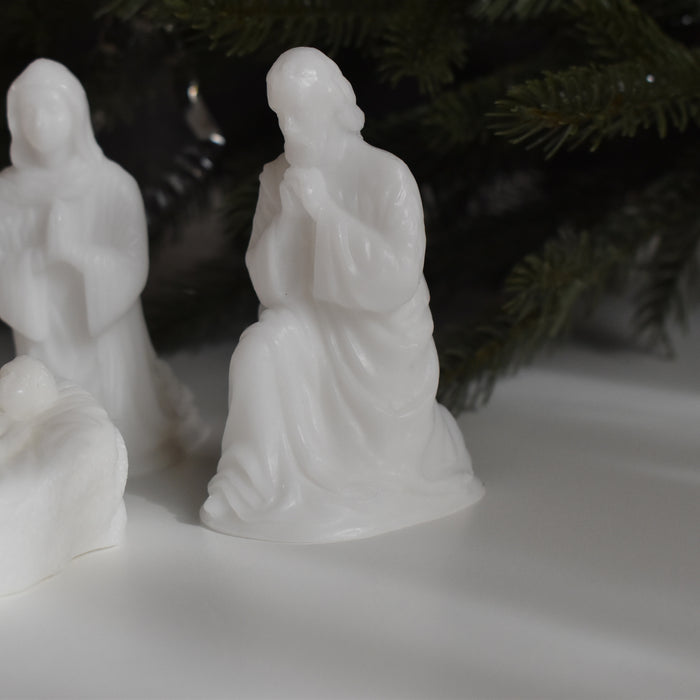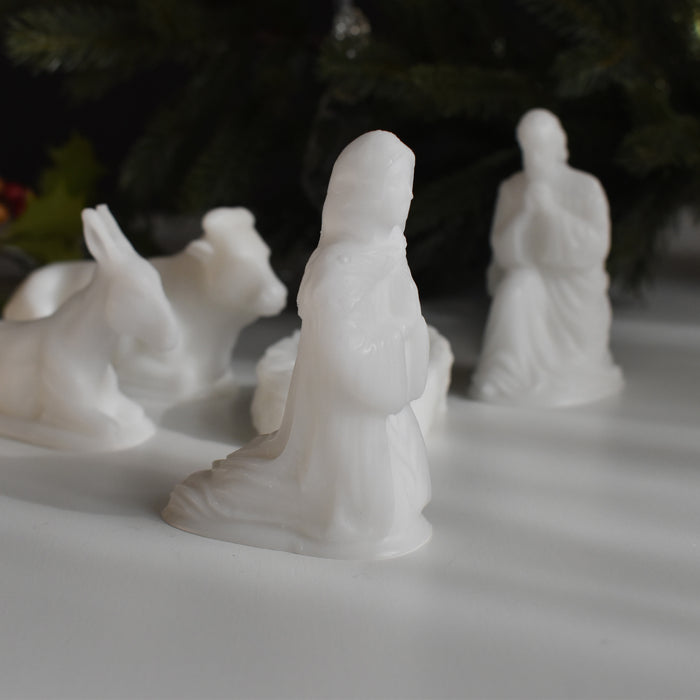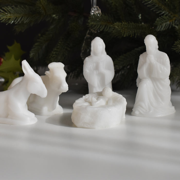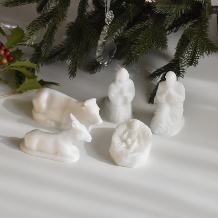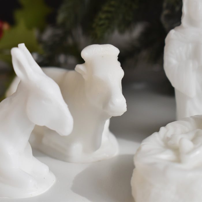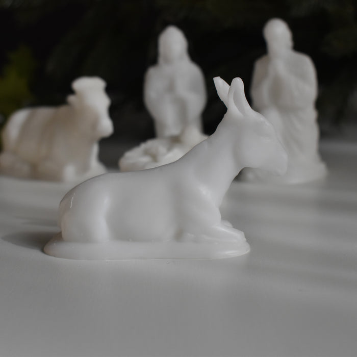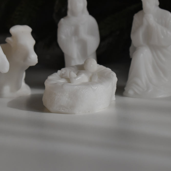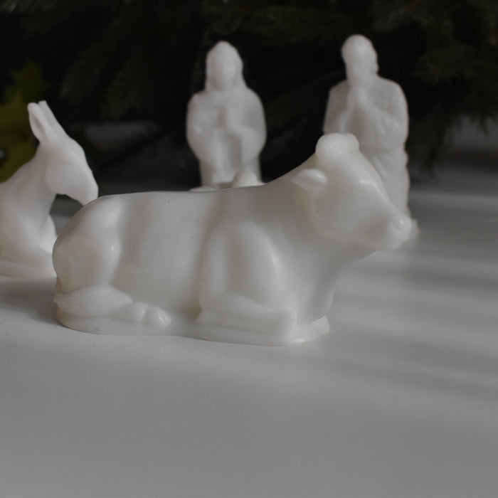 母マリアと父のヨセフ、そして牛とロバがイエス・キリストを優しく見守るように囲んでいます。一つ一つ手のひらに乗るほどの可愛らしいサイズですが、穏やかな表情や、柔らかな雰囲気が蝋で見事に再現されています。