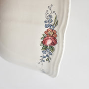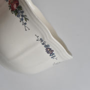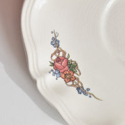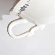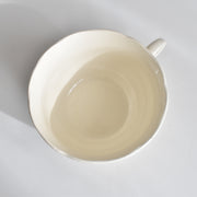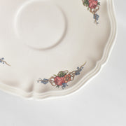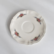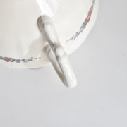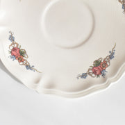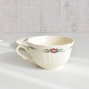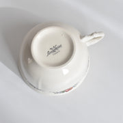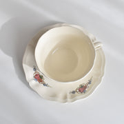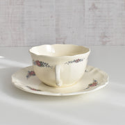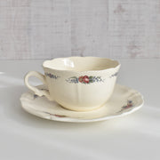 カップの側面とソーサーの縁には、バラや小花、リボンがあしらわれ、ティータイムを華やかに彩ります。