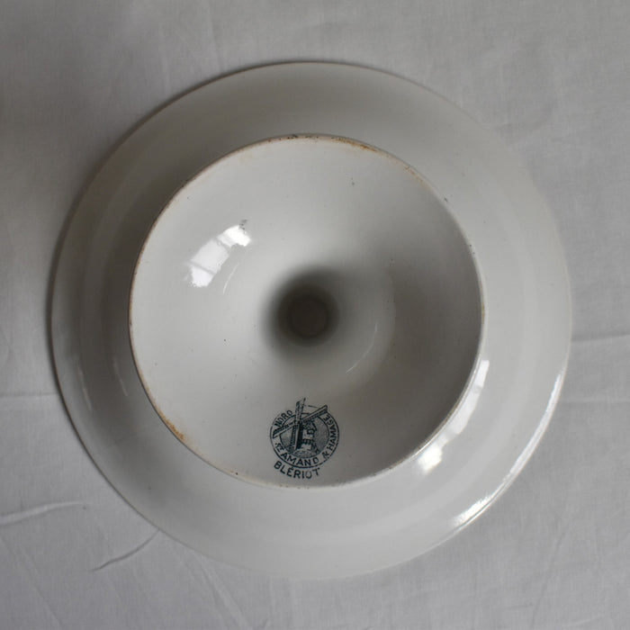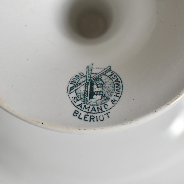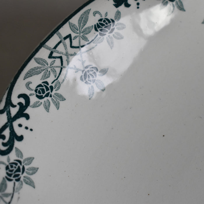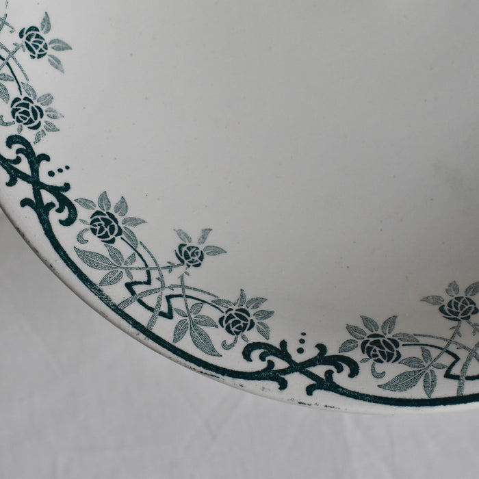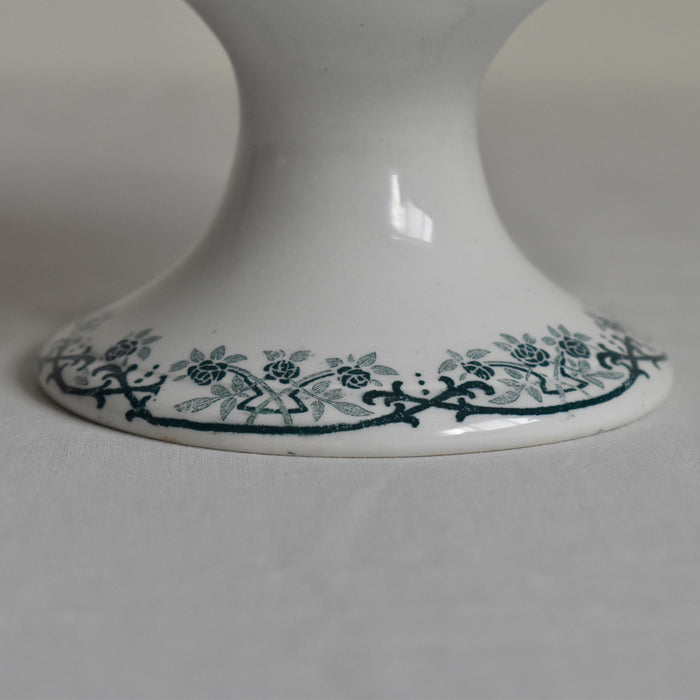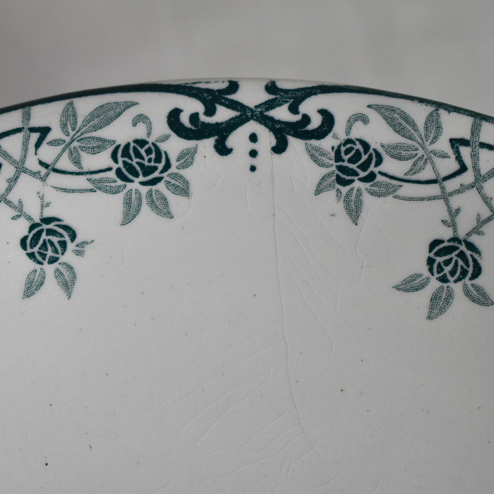 深い緑で描かれたバラのモチーフが、透き通るような白い陶器に美しく映えます。
