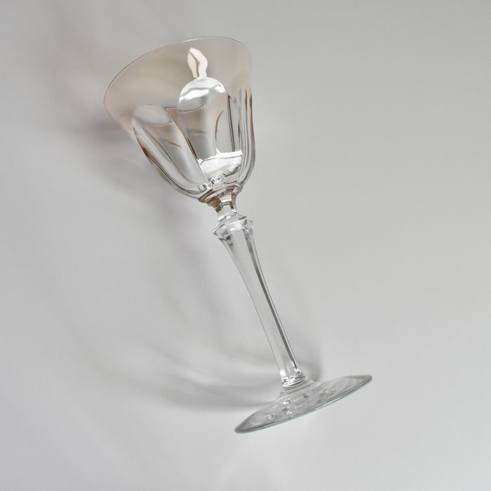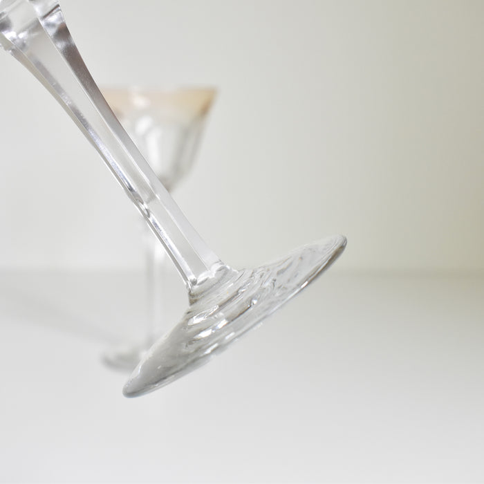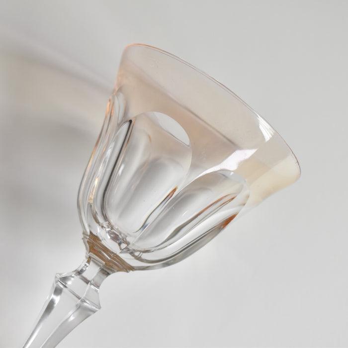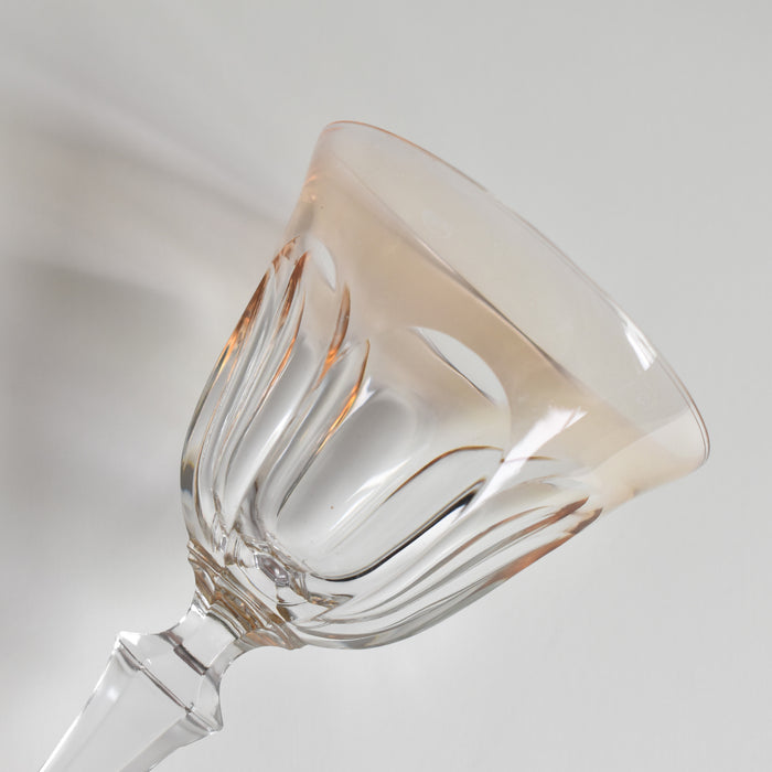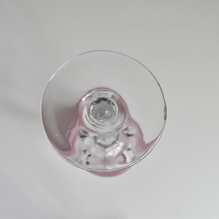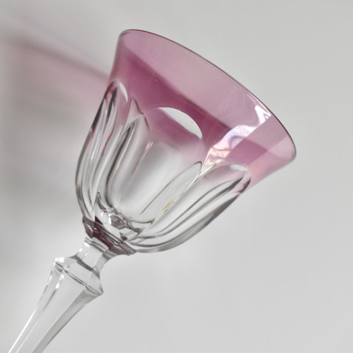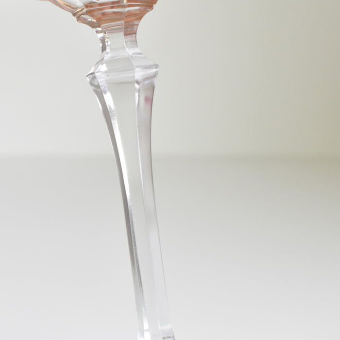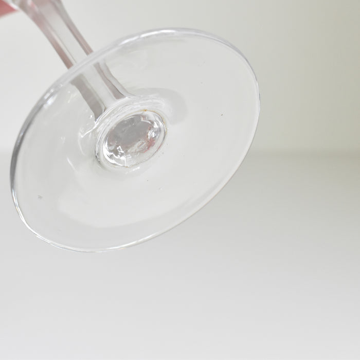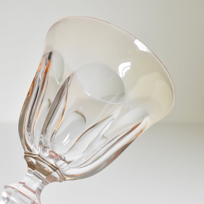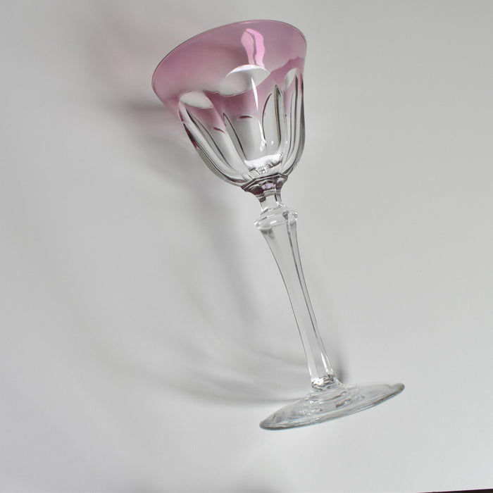 薄いオレンジとピンクのクリスタルワイングラスです。長いステムと上から見ると花のように広がるボウルが素敵なグラスです。