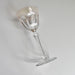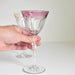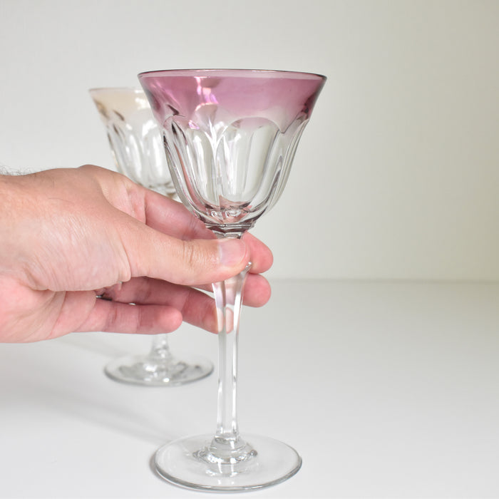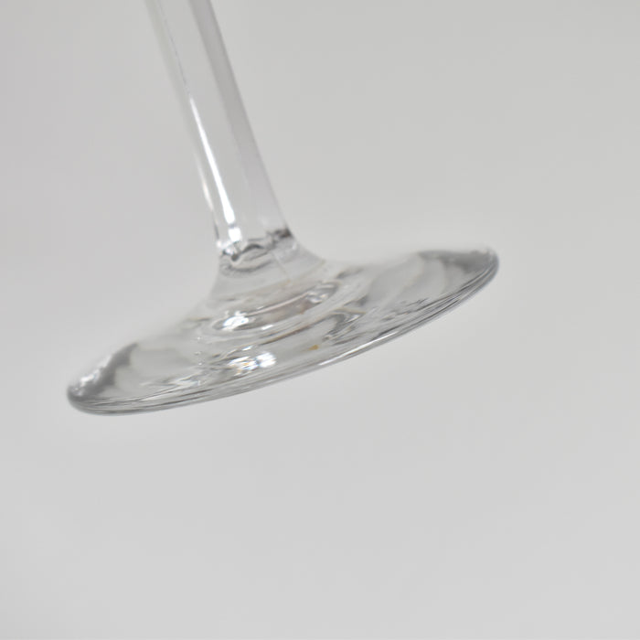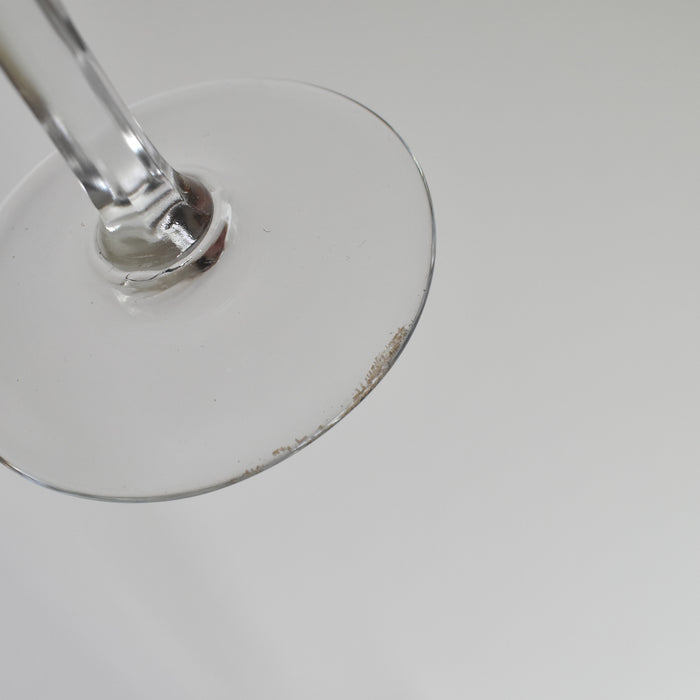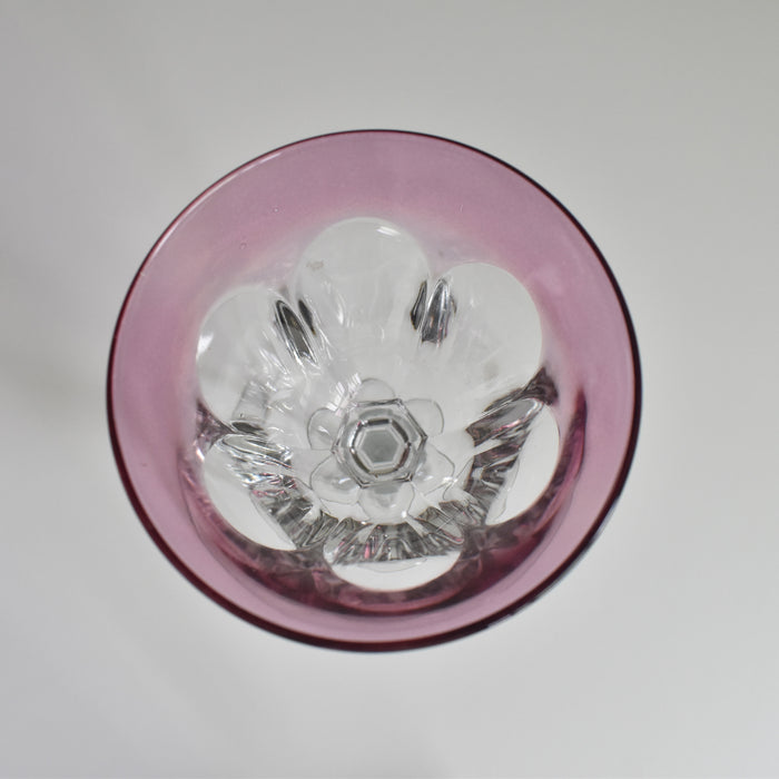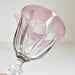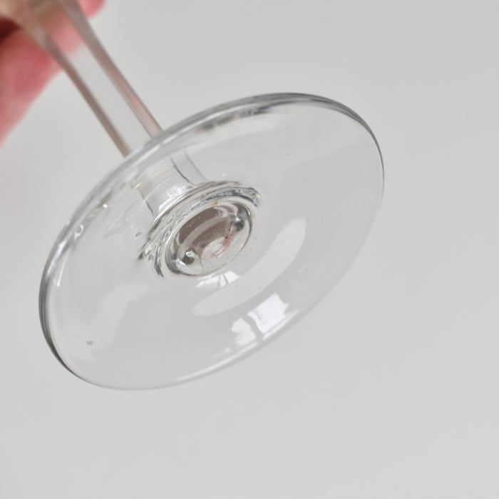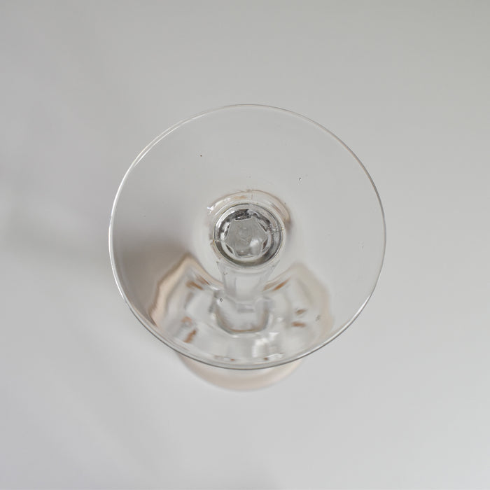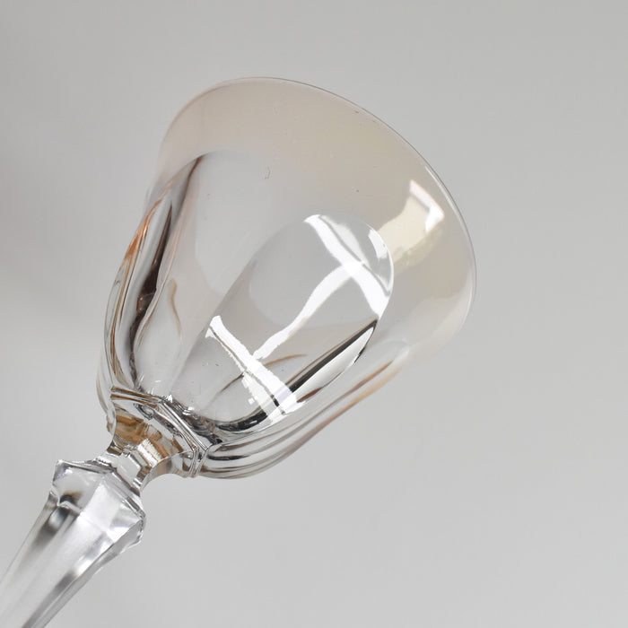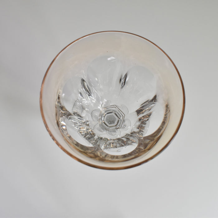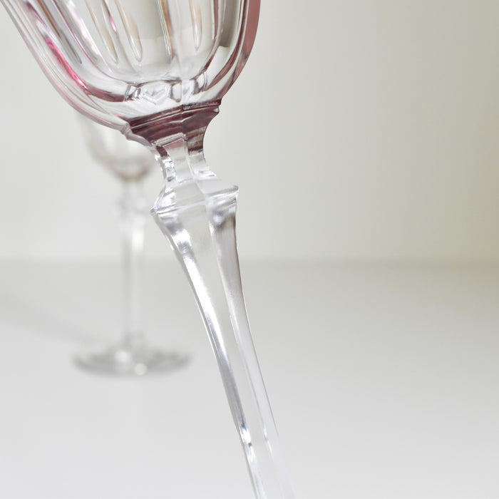 薄いオレンジとピンクのクリスタルワイングラスです。長いステムと上から見ると花のように広がるボウルが素敵なグラスです。