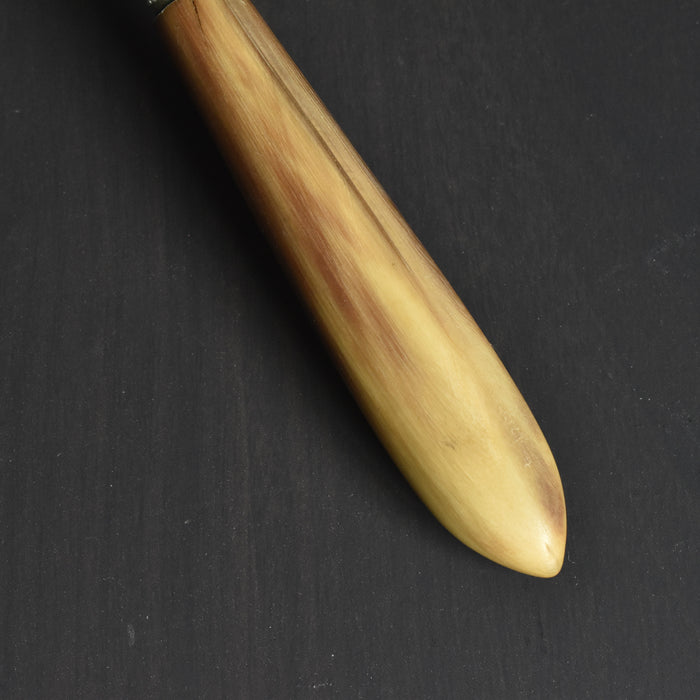 ブレードとハンドルを繋ぐ部分には、装飾が施された金属のカラーが配されており、全体のデザインを一層引き締めています。