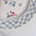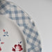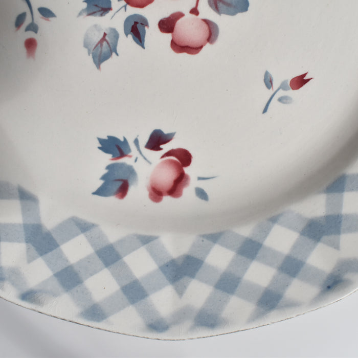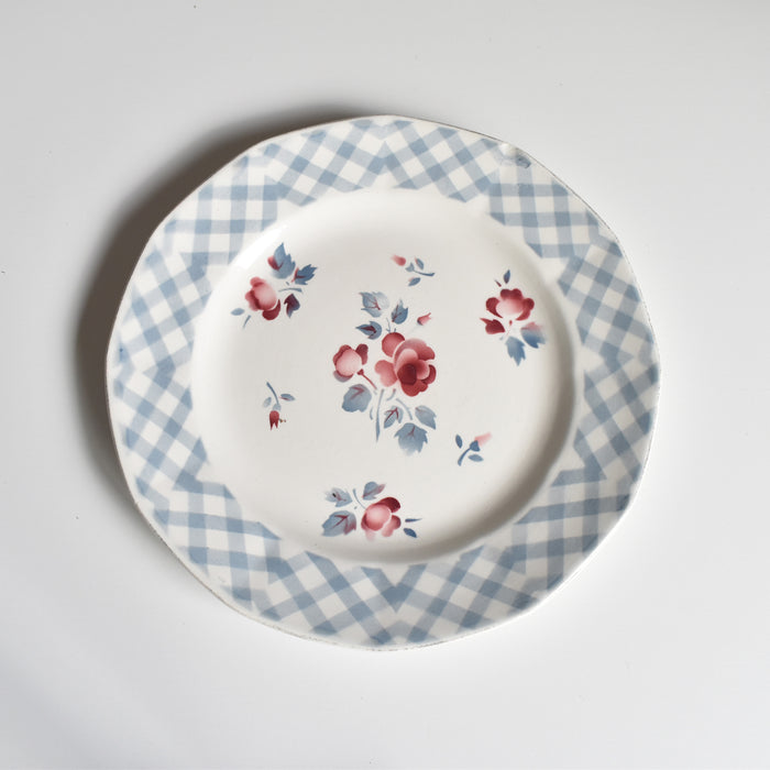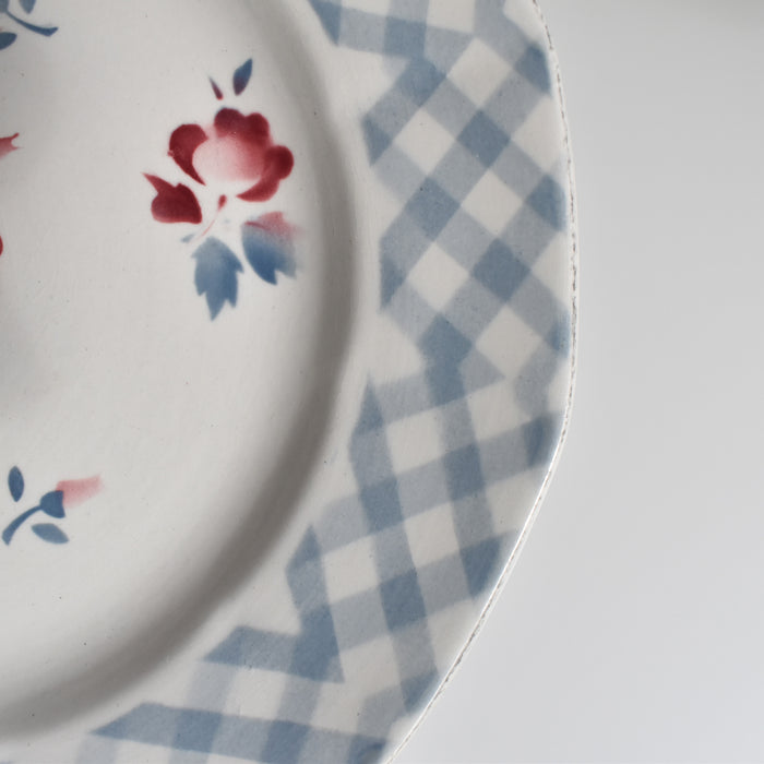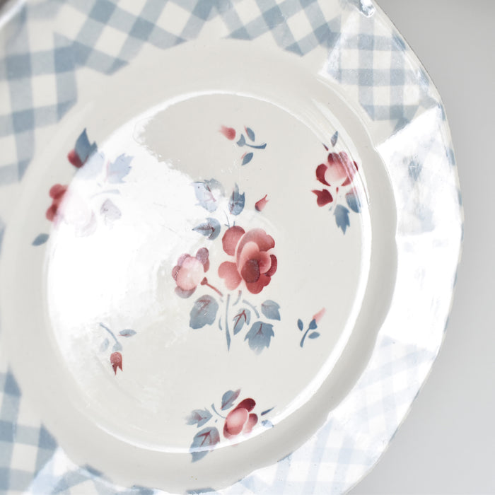 ステンシルのバラ模様とブルーのチェック柄との組み合わせが可憐な印象を与える一品。