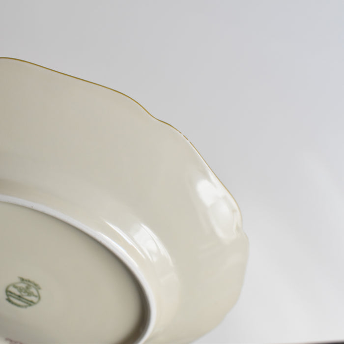 磁器のお皿で薄いクリーム色に仕上がられています。椿のような花が描かれていて素敵なシリーズです。