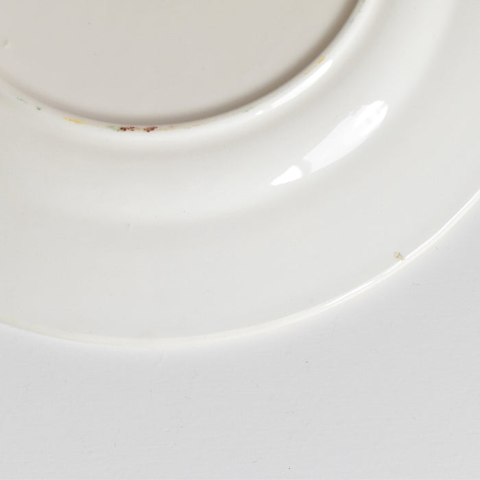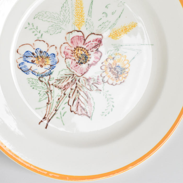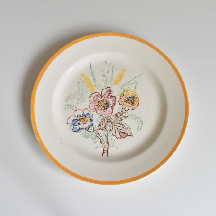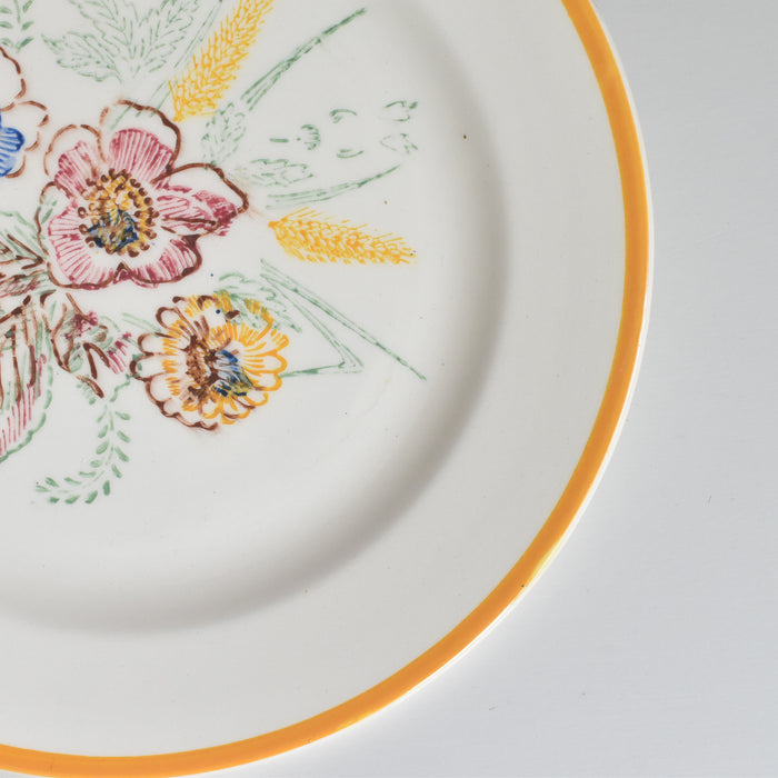 1950年代から1960年代に作られたこのプレートは、繊細な花のモチーフがスタンプ(転写)で施されており、食卓に明るさと時代を超えた美しさをもたらします。