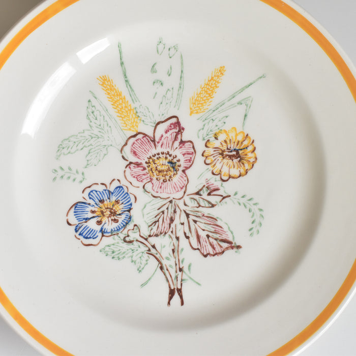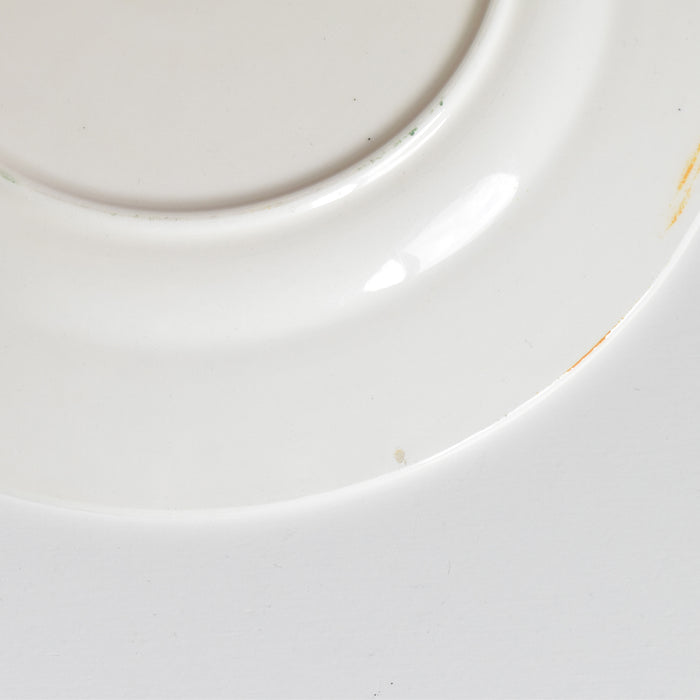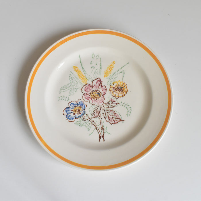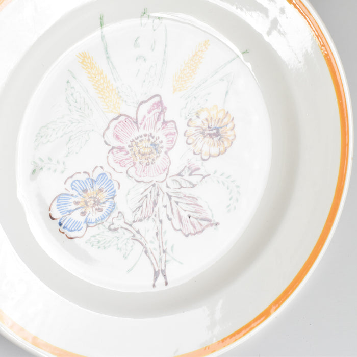 1950年代から1960年代に作られたこのプレートは、繊細な花のモチーフがスタンプ(転写)で施されており、食卓に明るさと時代を超えた美しさをもたらします。