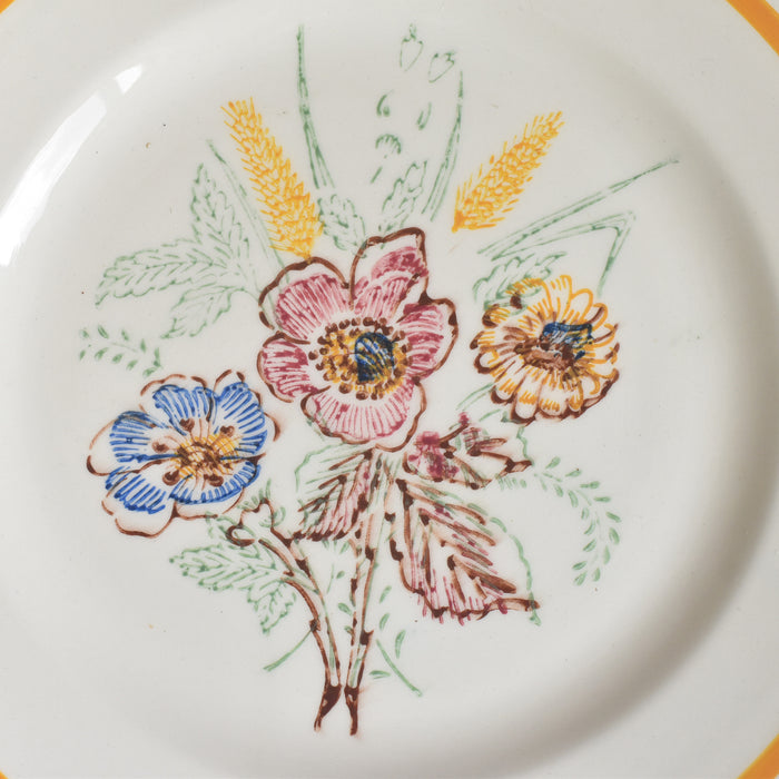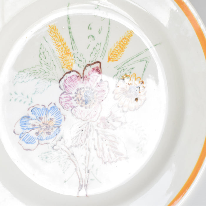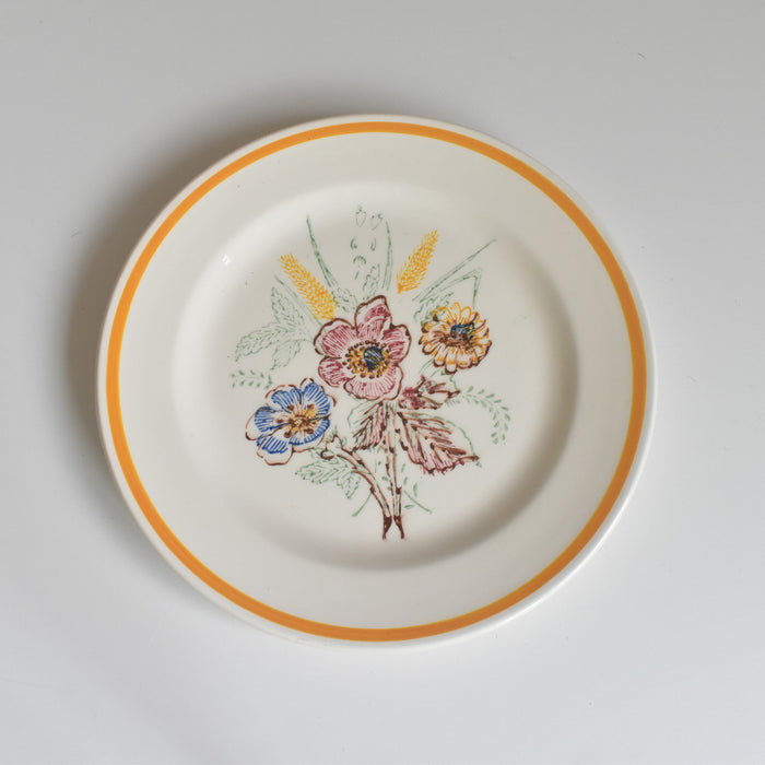 1950年代から1960年代に作られたこのプレートは、繊細な花のモチーフがスタンプ(転写)で施されており、食卓に明るさと時代を超えた美しさをもたらします。