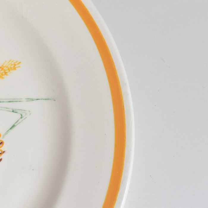 プレートの縁を彩る鮮やかなオレンジ色のボーダーは、この時代の特徴的な美意識を象徴しています。
