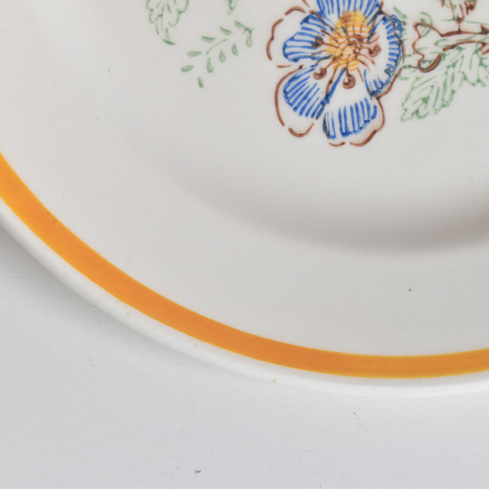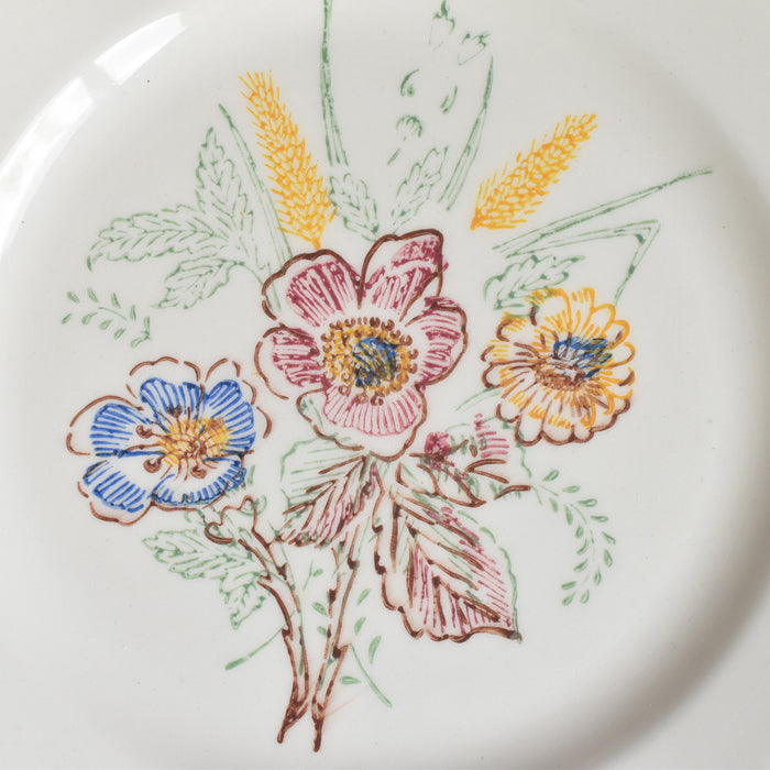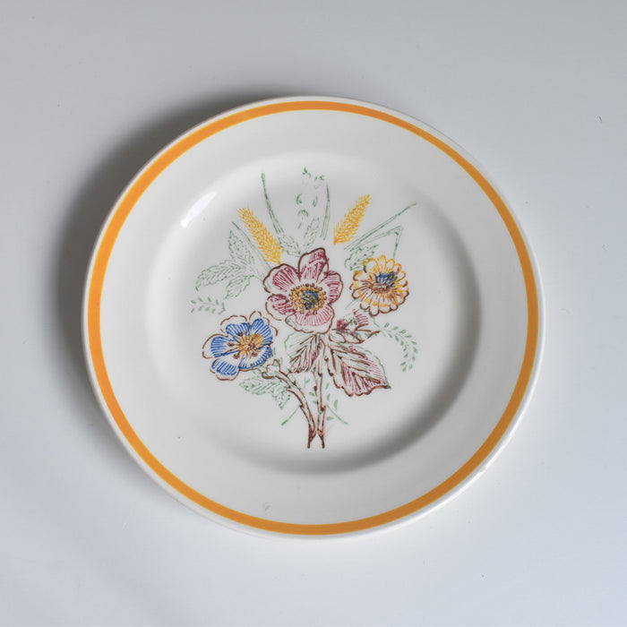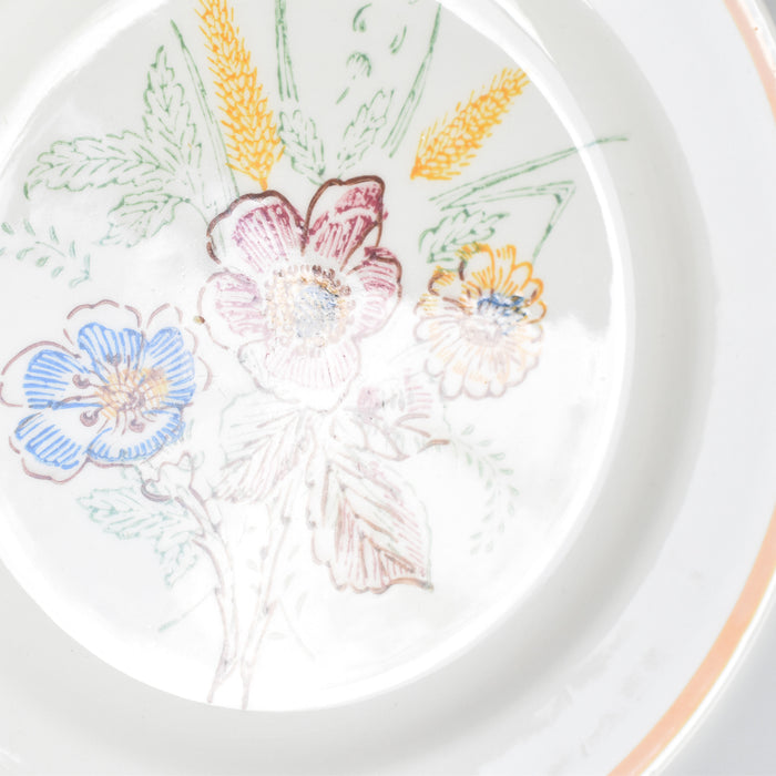 1950年代から1960年代に作られたこのプレートは、繊細な花のモチーフがスタンプ(転写)で施されており、食卓に明るさと時代を超えた美しさをもたらします。