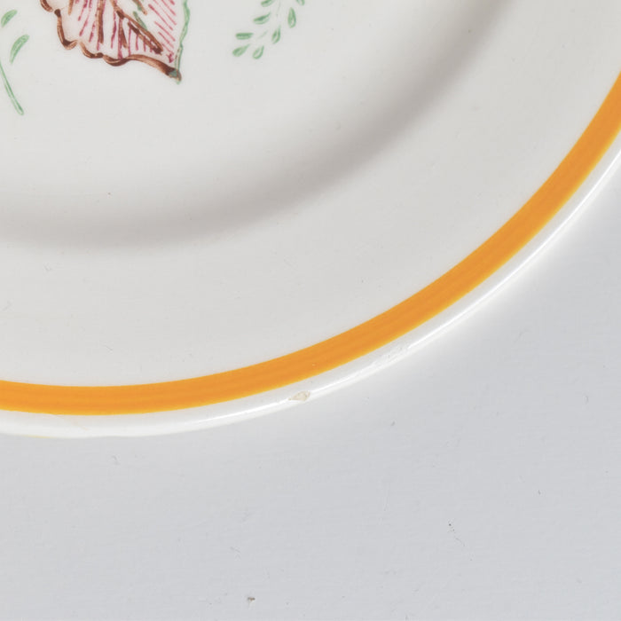 プレートの縁を彩る鮮やかなオレンジ色のボーダーは、この時代の特徴的な美意識を象徴しています。