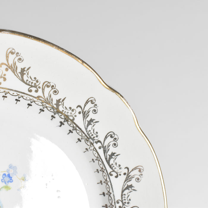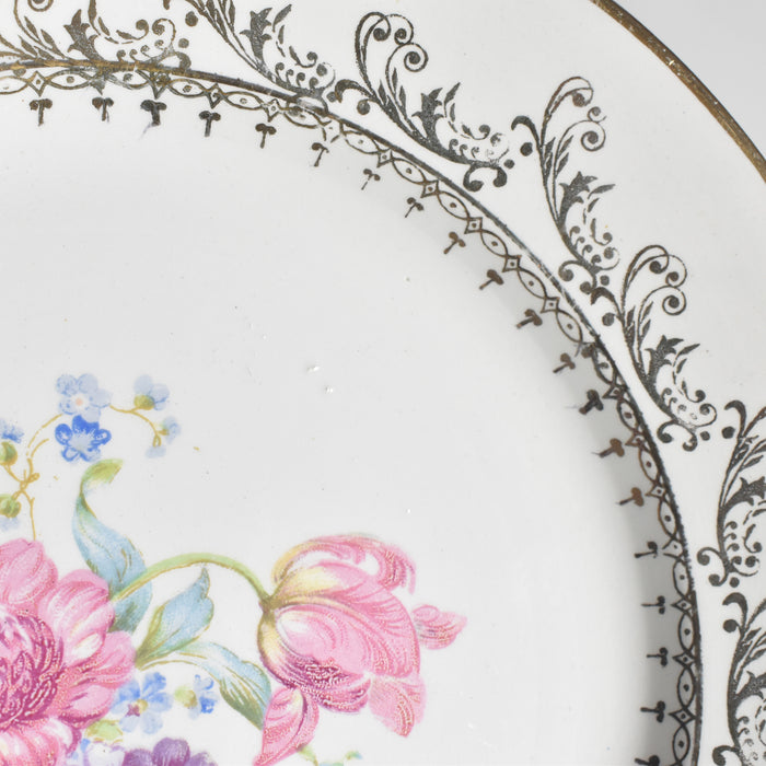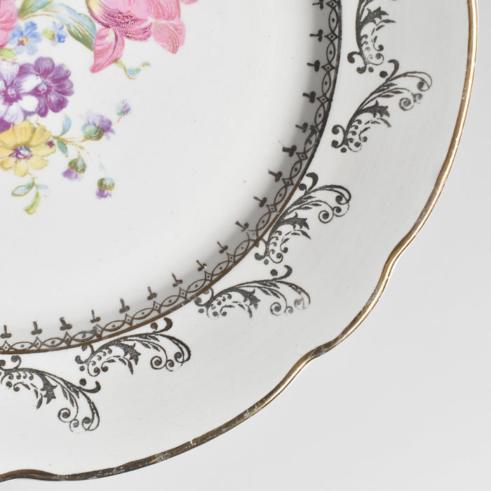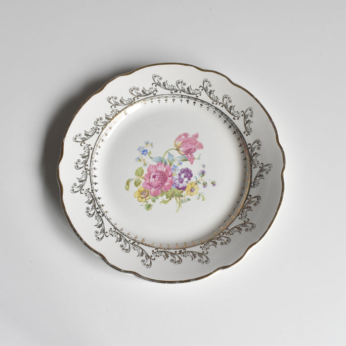 20世紀中期に作られたこの一枚は、温かみのある乳白色の肌に、繊細な金彩の縁取りと、生き生きとした花のプリントが美しく映えます。