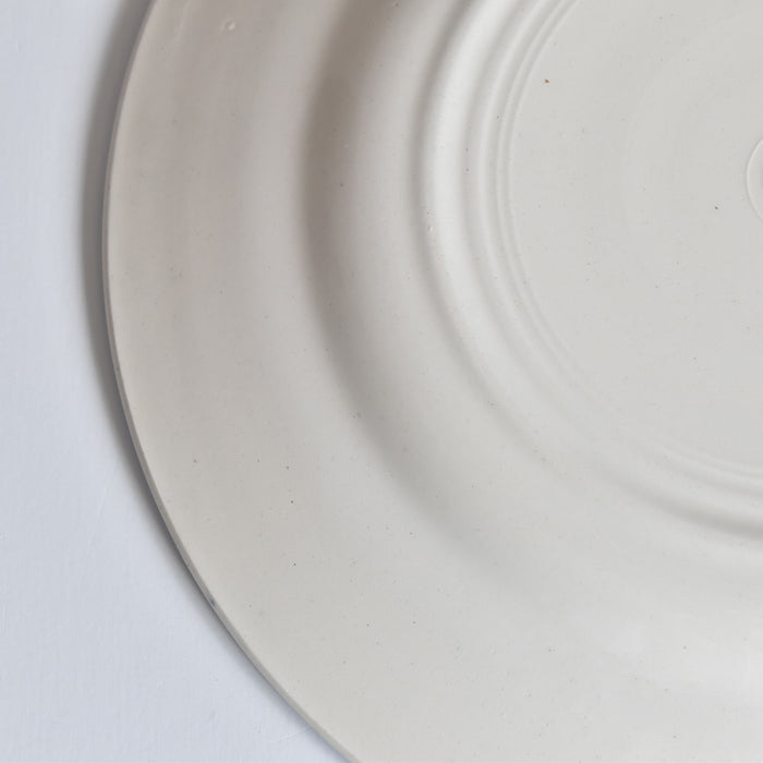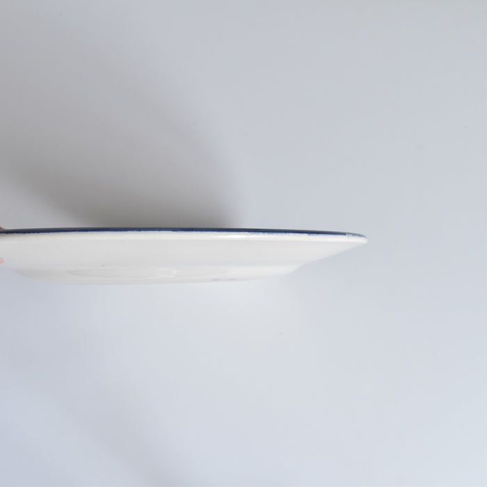 縁には、手描きによる鮮やかな青いラインが施され、白い地とのコントラストが美しく、お皿全体を引き締めています。