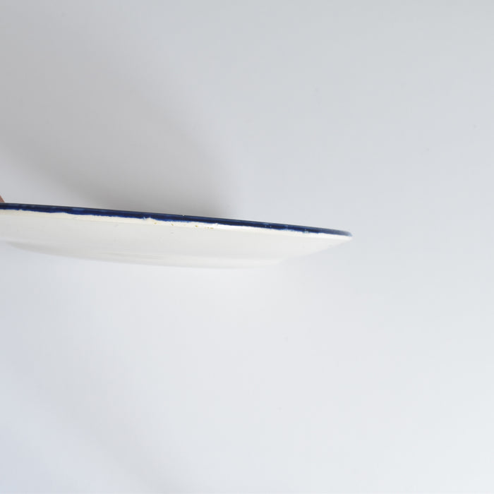 縁には、手描きによる鮮やかな青いラインが施され、白い地とのコントラストが美しく、お皿全体を引き締めています。