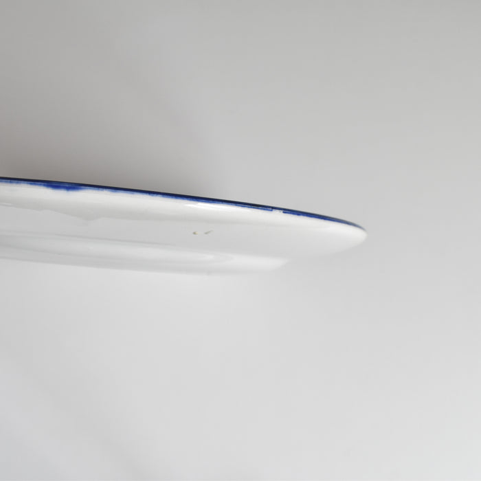 縁には、手描きによる鮮やかな青いラインが施され、白い地とのコントラストが美しく、お皿全体を引き締めています。