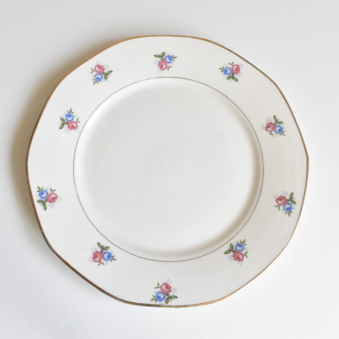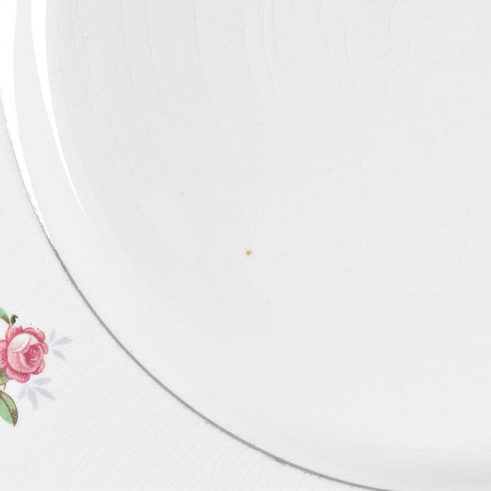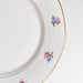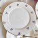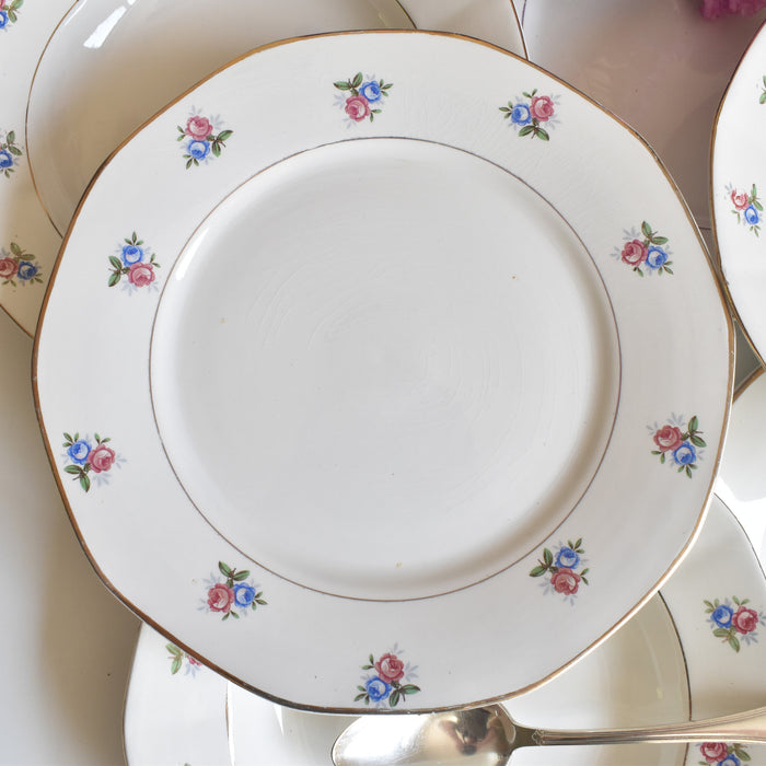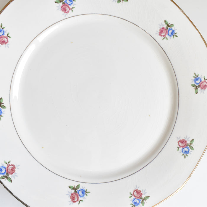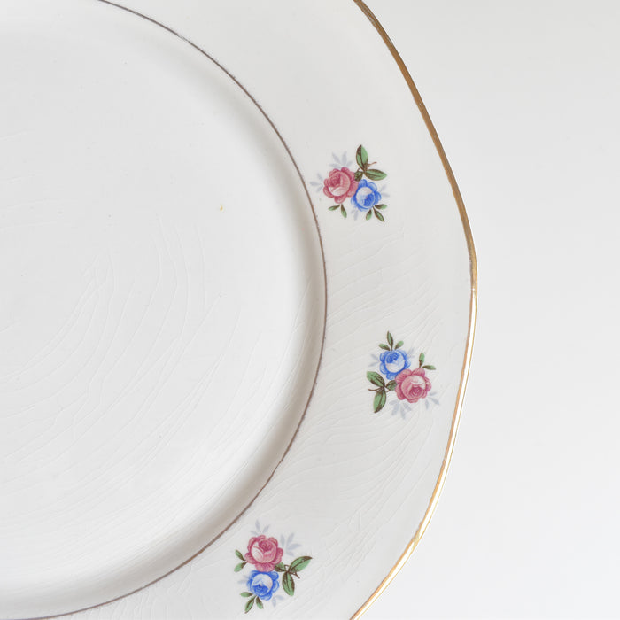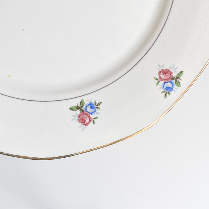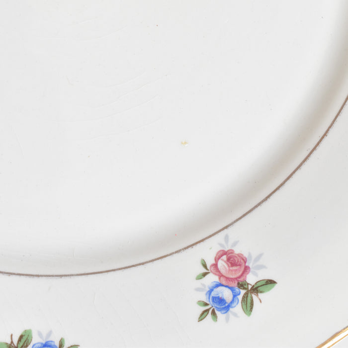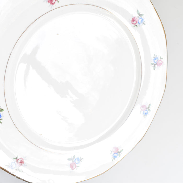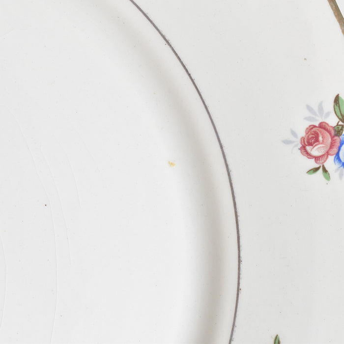 清廉なホワイトの素地には、小さく可憐な赤と青の薔薇のブーケがリズムよく配され、リムを愛らしく彩ります。