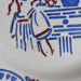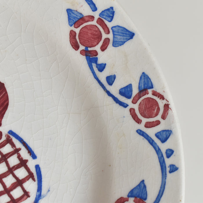 赤と青のシンプルながらも温かい色使いは、ステンシル技法によって丁寧に彩色されており、手仕事のぬくもりと、どこか懐かしい雰囲気を醸し出しています。