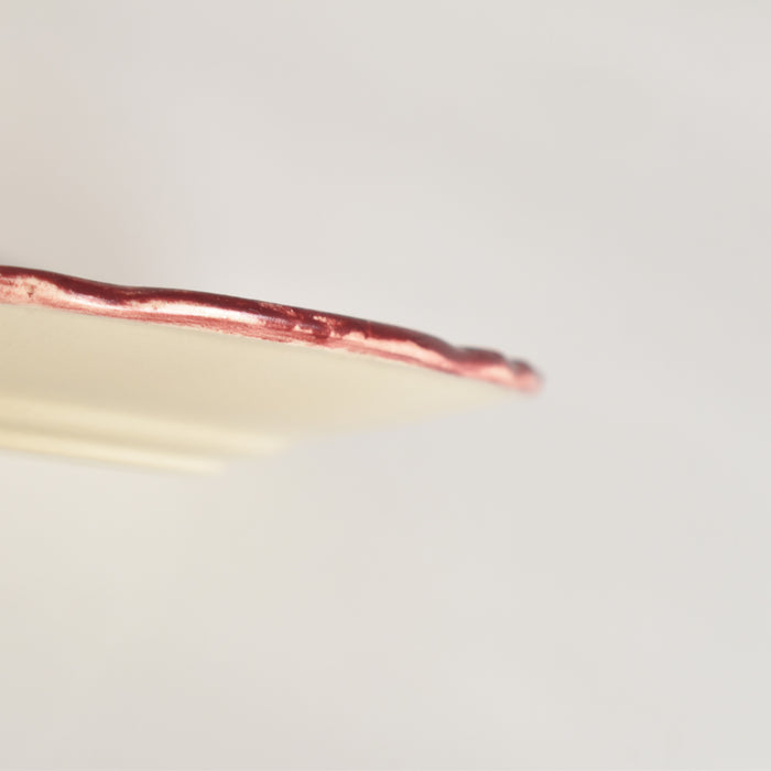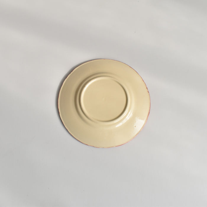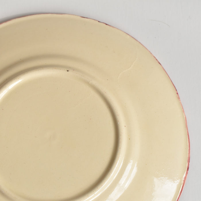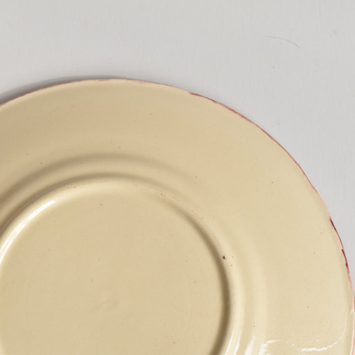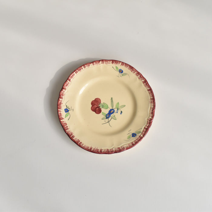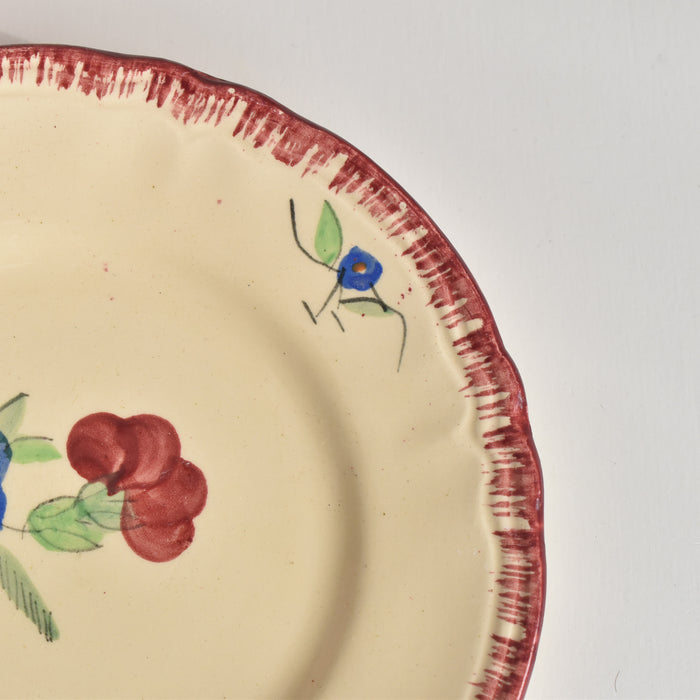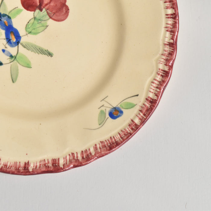 愛らしいお飯事(ままごと)用の小さなプレートです。ロンシャン窯らしい温かみのあるクリーム色の陶器に、ハンドペイントで丁寧に描かれた可憐な花模様が印象的です。