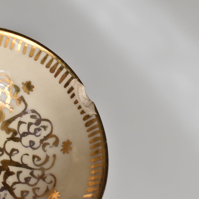 A.Dressinval 1954年から1976年まで、フランス・ブルゴーニュ地方で釜を持っていた陶芸家です。 全て手作業で作られ、作家の息遣いが感じられる細やかな金の装飾が魅力的です。 小さな丸い模様が、ブルゴーニュ地方のぶどう畑を連想させます。