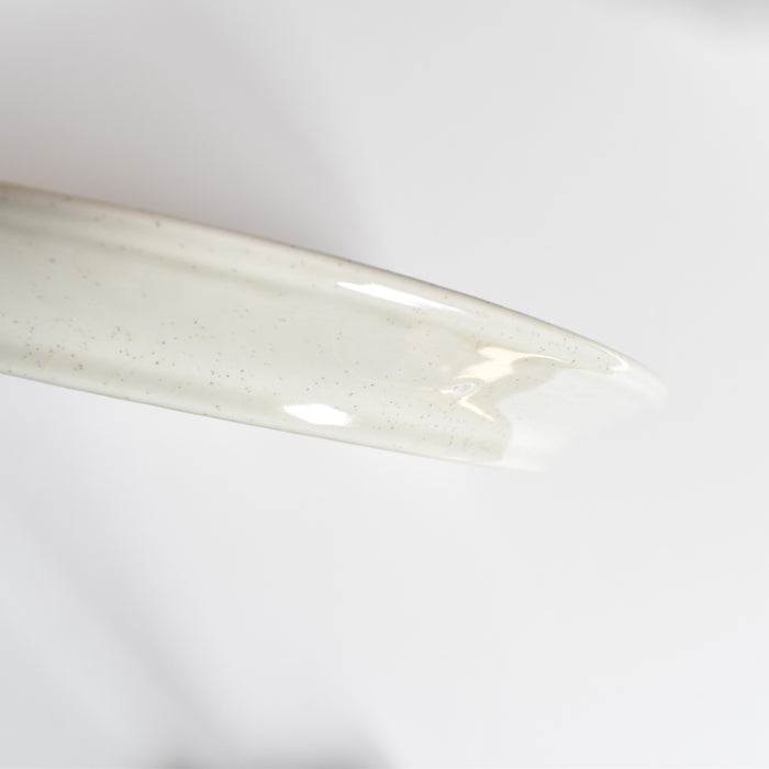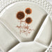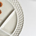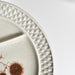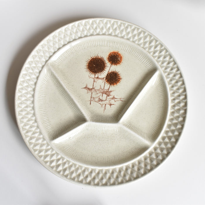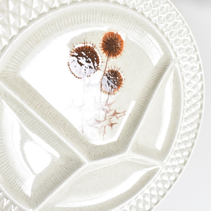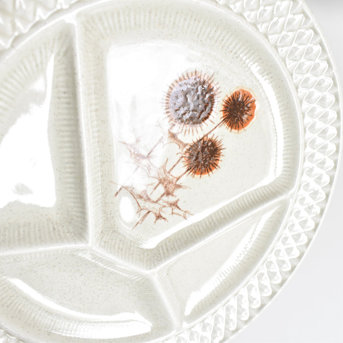 アザミの花が一枚一枚絵付けされています。縁にはダイヤ型のしっかりとした凹凸が装飾されており、シンプルな色合いですが印象的なデザインです。
