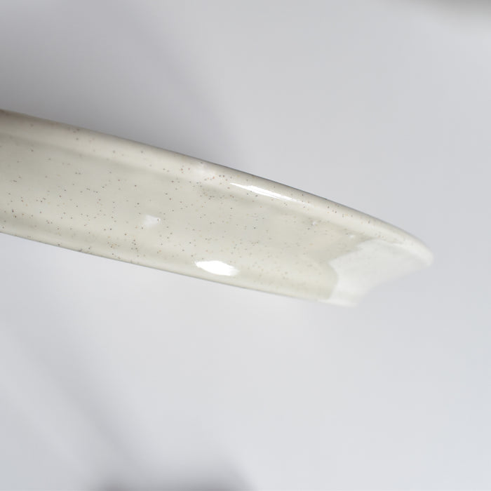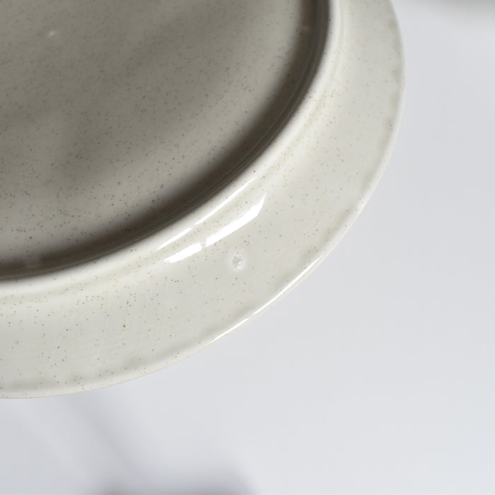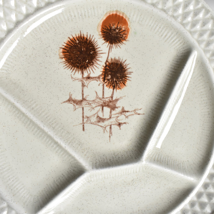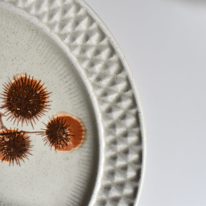 アザミの花が一枚一枚絵付けされています。縁にはダイヤ型のしっかりとした凹凸が装飾されており、シンプルな色合いですが印象的なデザインです。