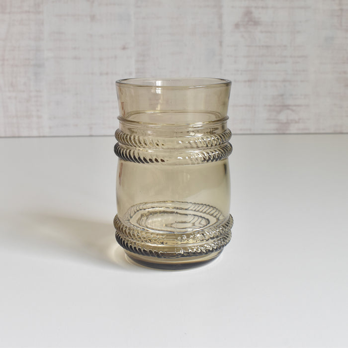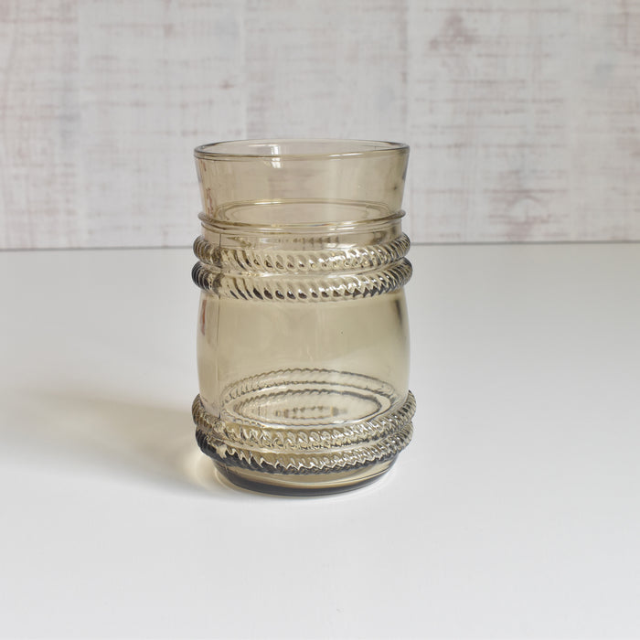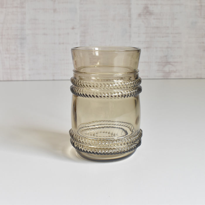 スモークグレーの落ち着いた色合いに、縄目のような立体的な装飾が施されており、温かみと個性を兼ね備えたデザインが特徴です。