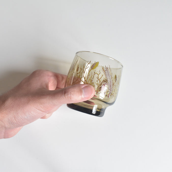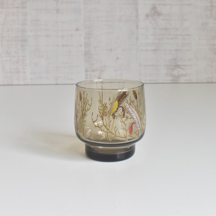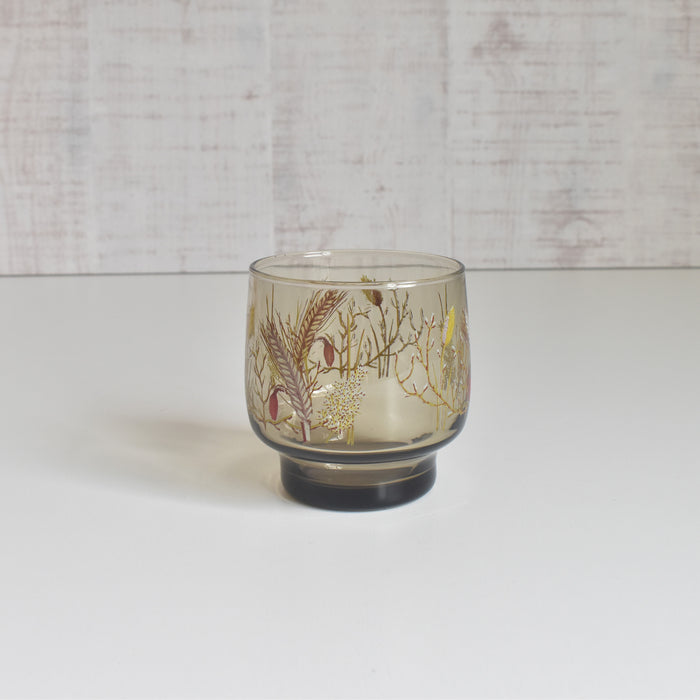 スモークがかった落ち着いた色合いのグラスに、実り豊かな麦の穂や草花が描かれた、温かみのあるデザインが特徴です。