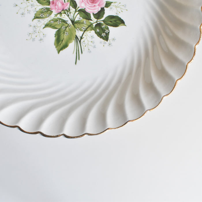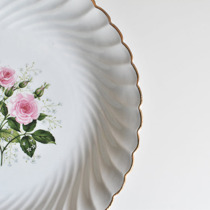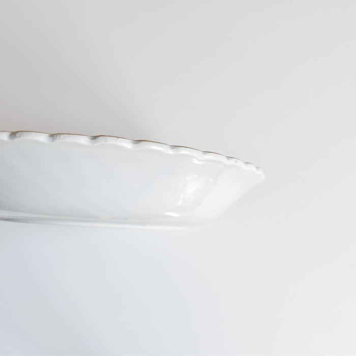 お皿全体を縁取るように施された、緩やかな波のようなレリーフと、上品なゴールドのラインが、さらにその美しさを際立たせています。