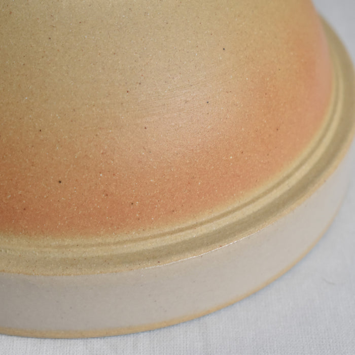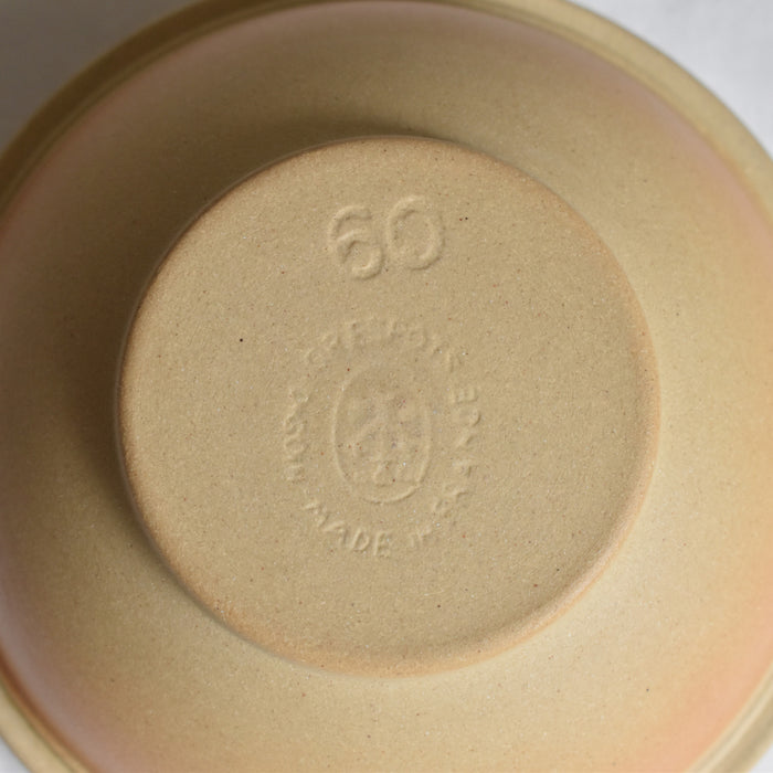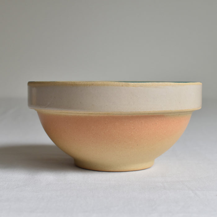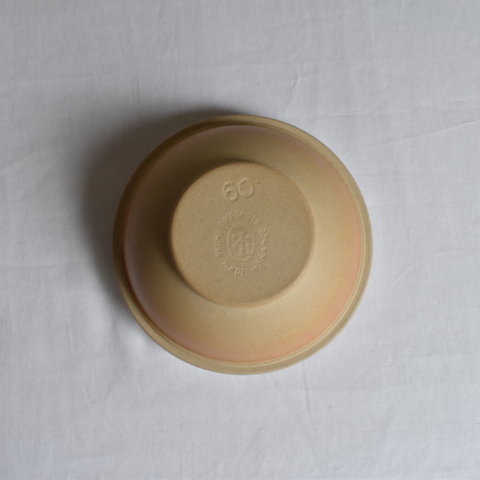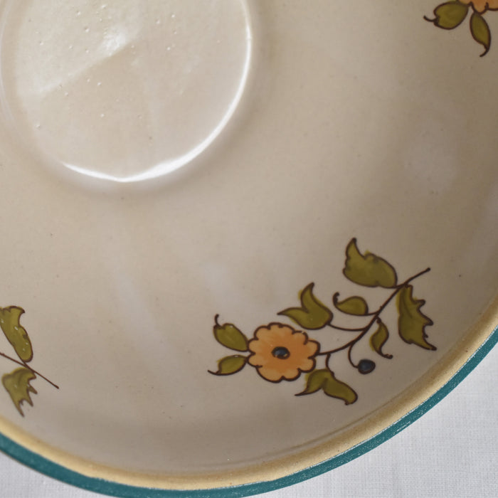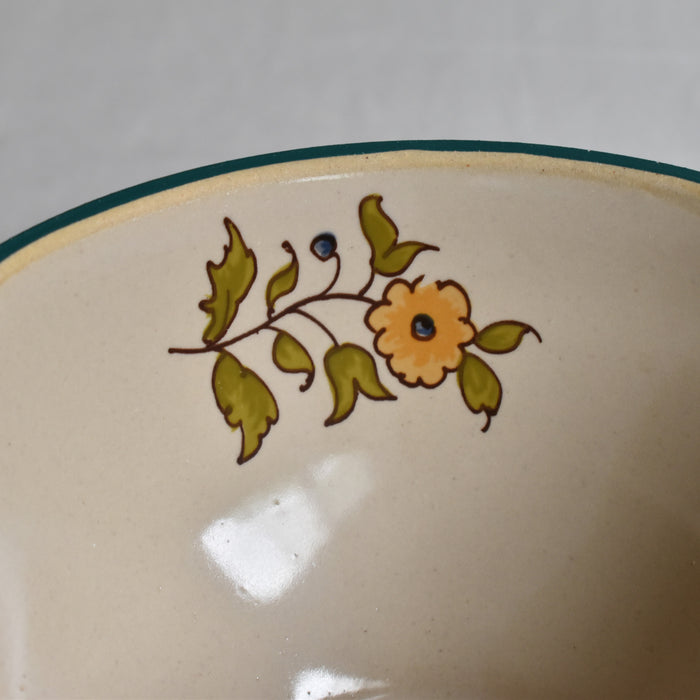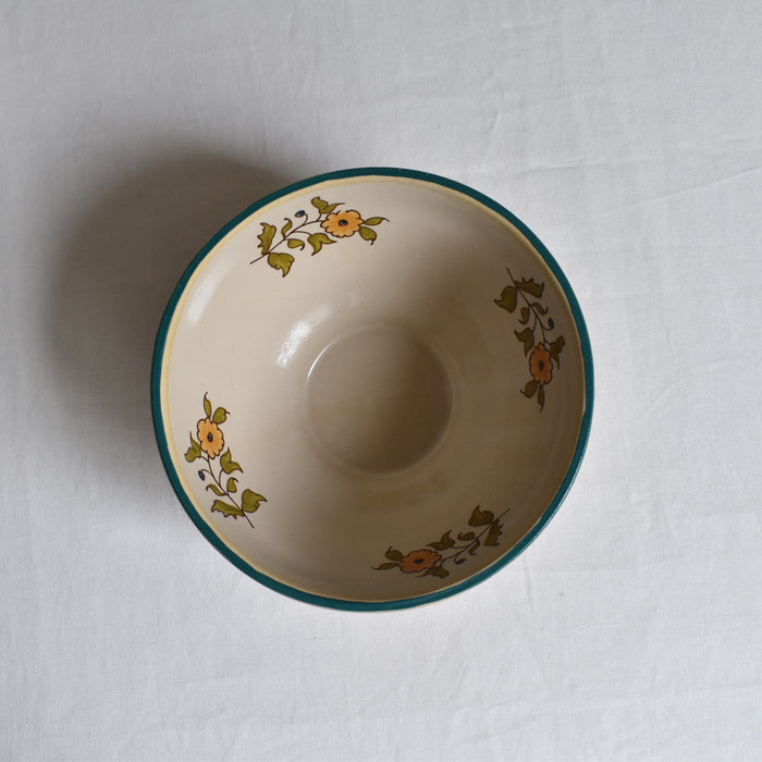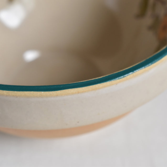 変色具合がよりカンパーニュの雰囲気を醸し出しているこちらのボウル。手で絵付けされた縁のグリーンや見込みの花模様もなんともレトロです。少し底の高さにズレがあり、ぐらつきがありますがそれも個性的。